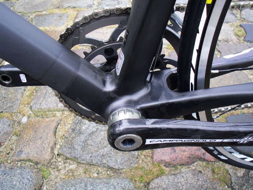 Het frame is gemaakt van Monobloc UD carbon. Even ‘vertalen’. De frame ’buizen’ zijn met elkaar verbonden met composiet lugs. Via het zogenaamde ‘Multi Process Hot Moulding’ worden de buizen en ‘verbindingsdelen’ met elkaar verbonden. De 586 bestaat vooral uit composiet. De achterpatten zijn van composiet, de voorvork is een full carbon HSC6 model met twee maten lagers, carbon patjes en het eigen HeadFit 2 systeem. Geen ‘plug’, maar een schuifbare alu huls over de vorkpijp. Die huls zit geborgd met een pen. Door een asymmetrische ‘topcap’ met schroefdraad aan te draaien worden de lagers op spanning gebracht –en verdwijnt de speling. Het bracket heeft nog wel schroefdraad.