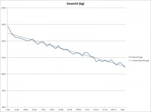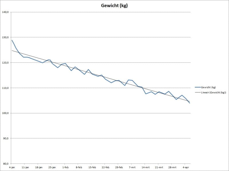 Het resultaat van dit voedingspatroon gecombineerd met de sporturen verbaast echter mij nog elke keer weer als ik op de weegschaal ga staan. Eerlijk gezegd had ik gehoopt om met de Marmotte (7 juli) onder de 110 kilo te wegen. Want ik heb al best wel wat afval ervaringen, maar 25 kilo in 6 maanden is al heel veel. Het is nu echter pas drie maanden na mij sportvastenkuur en ik ben aan gewicht al kwijt wat ik in 8 jaar was aangekomen. Vrijdag 6 april stond de schaal op ‘slechts’ 104 kilo. Dat had ik in mijn stoutste dromen niet durven dromen. De dubbele cijfer komen nu al heel dichtbij.