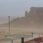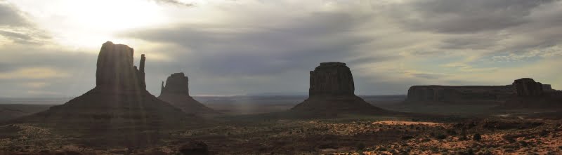 De zon is nog maar net op als we het nog een keer proberen bij Monument Valley. Dezelfde Indiaanse mevrouw zegt dat de camping gesloten is. Toch zien we de trucks van de filmmaatschappij massaal haar kassa voorbij rijden. Als wij vertellen dat we gehoord hebben dat er vandaag wel mogelijkheden zijn om te camperen, besluit ze iemand te bellen. Het resultaat is positief. Onze RV parkeren we tussen de vertrekkende filmcrew aan de rand van de kloof. We kijken van daar uit over het hele park. Vanuit onze achterraam kunnen we morgen de zon op zien komen over Monument Valley. Het is adembenemend mooi en helemaal voor ons alleen. Stof happen
