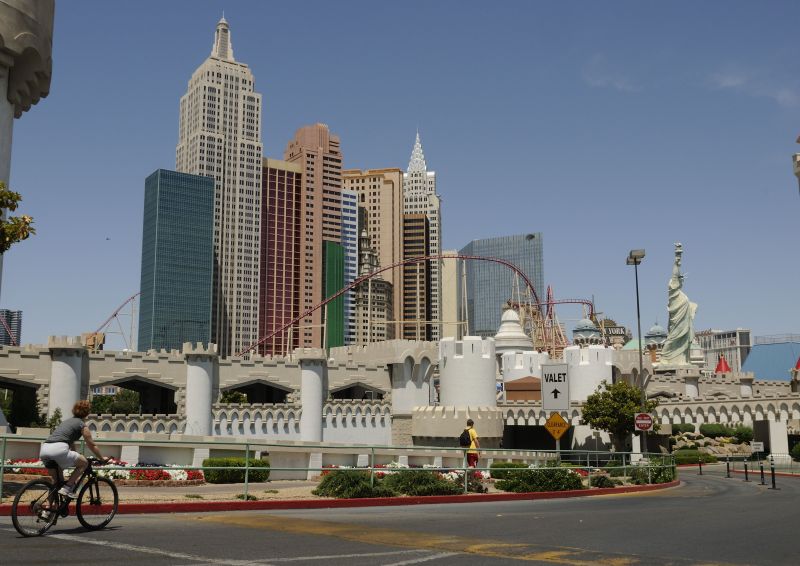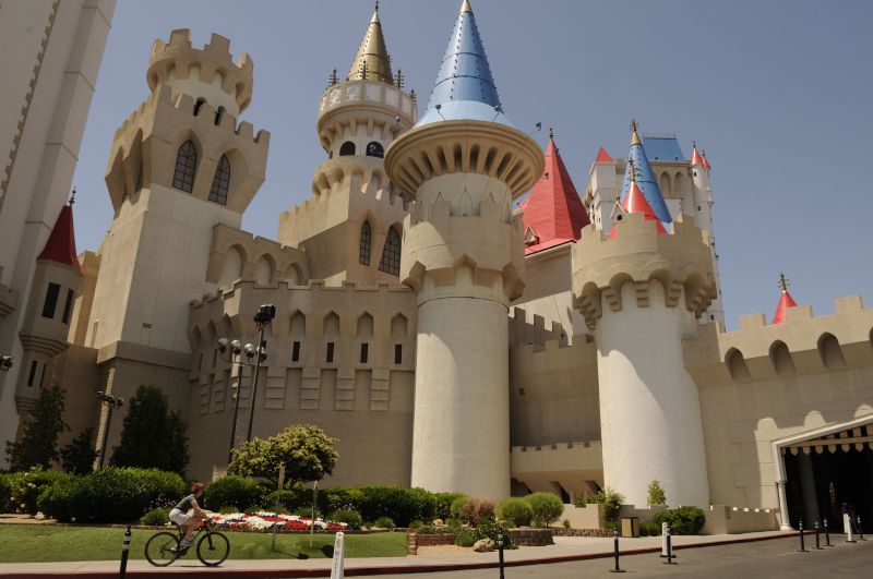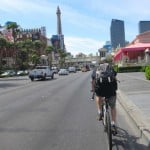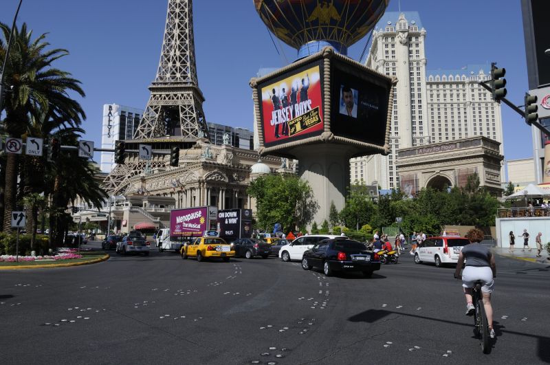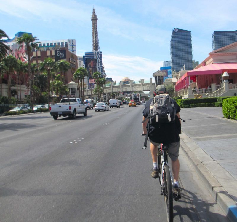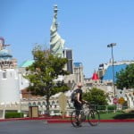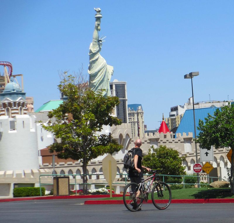 Las Vegas by bike Op de fiets en de Strip op. Dat lijkt best dapper want over vier rijstroken scheuren er auto’s. Toch lijkt het dapperder dan het is, want auto’s rijden met een grote boog om ons heen. Niet omdat wij zo afschrikwekkend zijn, maar Amerikanen worden niet graag aansprakelijk gesteld door een fietser als ze die aanrijden. Dat gaat namelijk bergen geld kosten. En om geld draait alles in Amerika. Niet dat Nederlanders op dat punt veel beter zijn overigens. ‘Dass war einmal’ om in goed Grieks te blijven. Onze bikes parkeren we steeds bij de hoofdingang van de casino’s tegen een hek. Soms zie je de strak in het pak gestoken bewakers twijfelen of ze daar iets van moeten zeggen. Ze doen het niet en wij struinen overal naar binnen om daarna weer via via het volgende hotel – casino te bekijken.