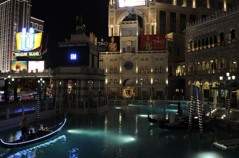 Er is een ‘all you can eat’ restaurant waar we ons te vol stoppen met de verkeerde dingen. Ook wel eens lekker na een maand gezonde kost in ‘Chez Ingrid a la RV’. Met een te volle buik is het ´s avonds tijd voor The Strip. De casino’s annex hotels staan naast elkaar. Het zijn enorme bouwwerken met vaak duizenden kamers. De meeste hebben een eigen thema. Zo is in The Venetian, half Venetië nagebouwd, compleet met grachten, gondels, de Miralta brug en het San Marco plein. Binnen is het pracht en praal. Italiaans marmer, fresco’s en alles wat er bij hoort. We willen er meteen de bestelde kaartjes ophalen voor de voorstelling van The Blue Man Group. Die stonden nog steeds op ons lijstje. Merken we meteen