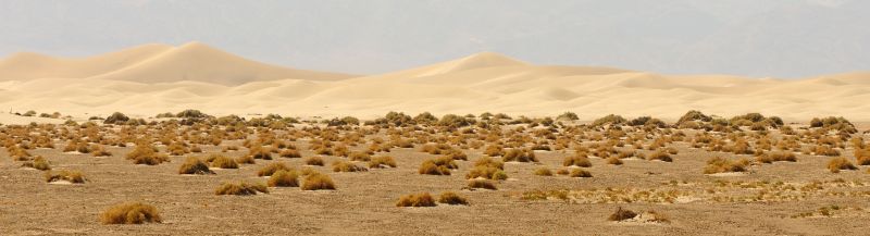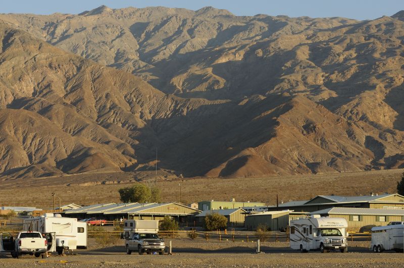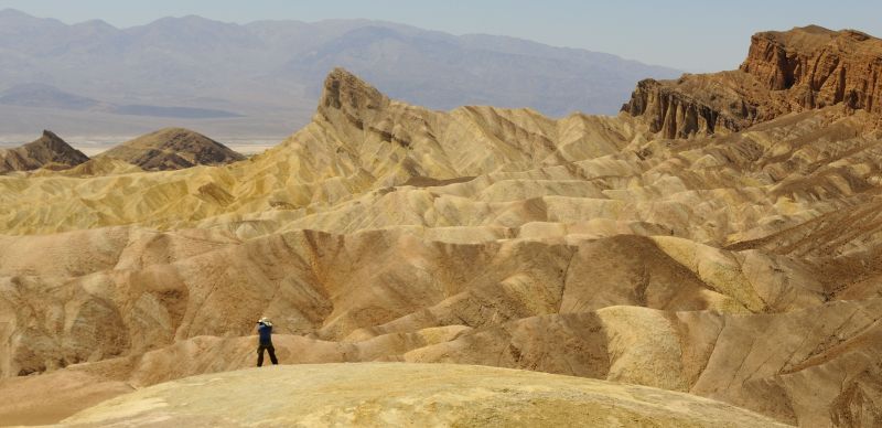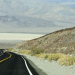 Terug in hotel zijn we het over een ding in ieder geval eens. In uitstraling en kwaliteit staat Circus Circus echt onder aan de ladder. Las Vegas –Death Valley Voor ons doen zijn we laat op. Kwart over acht. Zeker moe van al dat nachtbraken. Een uurtje later zijn we onderweg naar Death Valley dat slechts 160 kilometer verder naar het noord westen ligt. Het gebied ligt grotendeels onder zeeniveau en is de warmste op aarde. Temperaturen boven de 50 graden Celsius zijn er in de zomer geen zeldzaamheid. Reden genoeg om er aan het begin van onze reis heen te gaan. Het is er vandaag gelukkig niet al te warm, slechts 40 graden. De airco in de auto maakt overuren. Op het uitzichtspunt Zabrikski’s point stappen we op het parkeerplaatsje uit en beklimmen de kleine heuvel om bij het echte fotogenieke plekje te komen. Een minuut of tien later krijgt Ingrid het koud van de warmte. Da’s niet goed. Gelukkig brengt ons ‘buske’ weer verkoeling. We stoppen in Stove Pipe Wells Village. Die bestaat uit een RV-park, een pompstation (met de duurste benzine van Amerika) een motel met saloon met de naam Badwater. Alleen voor Nederlanders klopt de naam als een bus. Er is namelijk een klein zwembad bij het motel. Is de naam bad water toch goed.