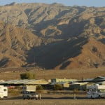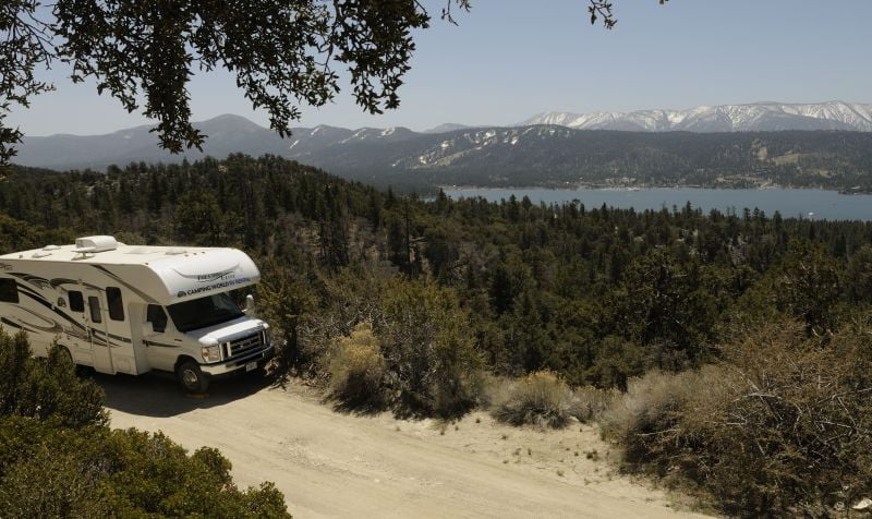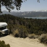 Als tussenstop rijden we naar Big Bear Lake. Dit op advies van een reisboek. De route over highway 18 is op de kaart een vrij rechte streep. In real life is dat toch een ander verhaal. De weg wordt een smal en vooral steil en kronkelend bergweggetje dat in de richting van de hemel klimt. En dat klimmen gaat in onze bus nou niet echt heel snel, dus het kost wat tijd. Niet dat er onvoldoende PK’s onder de kap liggen. Meer omdat hij zo groot is en de krappe haarspeldbochten met de nodige voorzichtigheid moeten worden genomen. Op zo’n 2200 meter hoogte bereiken we Big Bear Lake. Niet alleen het meer heet zo, het stadje dat er aan ligt ook. Op de omringende bergen ligt nog heel wat sneeuw. De skipistes zijn nog maar net verlaten. In het lokale informatiecentrum geeft een studentikoos type informatie over mountainbiketochten en RV-parks. Van degene die open zijn lijkt Lighthouse RV-park, dat direct aan het Big Bear meer ligt, de beste keus. De prijs blijkt niet mee te vallen $ 50 de duurste plek tot nu toe. We zijn te moe om verder te zoeken, dus drentelt de camper naar zijn plekje.Onder het eten is de conclusie eensluidend. Vandaag van het warmste en laagste plekje van Amerika omhoog gereden naar misschien niet het hoogste en koudste, maar het ging toch serieus in die richting.
