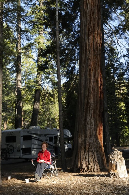 Onze camper vindt een schitterende plek op de eveneens schitterende campground. We staan onder mooie dennenbomen en sequoia’s. Volgens de instructie moet al het eten in een speciale stalen berenkast die bij ieder plek staat. Beren ruiken op 5 km afstand al dat er ergens een dode ree ligt, dus een lekker hapje in een tent van camper is zo gevonden. We lezen dat een beer per dag 5.000 tot 20.000 calorieën eet. En heeft een beer eenmaal voedsel van mensen gegeten dan gaat ie steeds vaker op jacht in kampeerplekken en moet zo’n beer worden afgemaakt. En dat willen we natuurlijk niet. Daarom we laden de hele camper leeg, alles waar een geurtje aanzit tot afwasmiddel toe moet eruit. Da’s een hele klus. In één keer zijn beren toch niet van die leuke beesten. Na dertig keer de camper uit naar de berenkluis, zijn het ronduit irritante dieren. Bij de honderdste keer verwensen we ze. The general