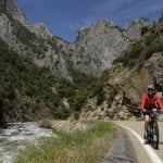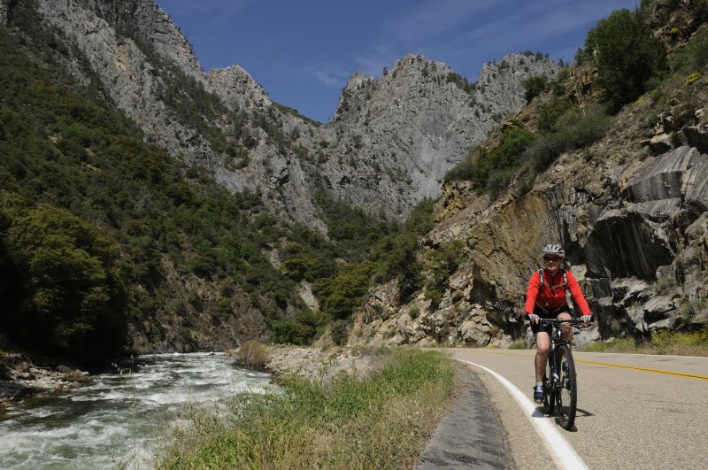 Op tijd op, want vandaag staat de fietsrit door Kings Canyon op het programma. We zitten helemaal in het begin van het park, dus het hele traject ligt op ons te wachten. Vanaf de campground een klimmetje van een 75 hoogtemeters om op te warmen. Dan de diepe in. Eerst door weelderige bossen met her en der een sequoia. Die bomen met hun opvallend rode bast vallen altijd op en geven een weg iets speciaals. Dan onverwacht opent de canyon zich voor ons. Een wonderschoon gezicht. In de diepte tussen elkaar overlappende ruige bergen wringt een dun zilveren lint zich door de diepte. Het is het snelstromende water van de Kings rivier in de ochtendzon. De bergen vormen een steeds nauwer wordende kloof. De weg slingert als op hol geslagen spaghetti langs de bergwand naar beneden. Zo’n 1150 meter suizen de bikes over het strakke asfalt. Nu er nog maar niet aan denken dat de benen straks iedere meter weer omhoog moeten. De Canyon loopt namelijk dood en de enige weg is terug omhoog. 930 meter is het diepste punt van vandaag. Op dat punt is een winkeltje waar koffie en wat snacks te koop zijn. Liefhebbers kunnen er ook grotten bezoeken. Tot die categorie horen wij niet. Wel tot de categorie koffie fanaten. Pas als ons cafeïnepeil weer op orde is fietsen we verder. Tot aan het einde van de kloof rijden we naast de rivier. Dat zijn toch nog 17 kilometer. Voor je rust hoef je daar niet te rijden, want de rivier maakt een hels kabaal. Voor mensen die niet van klimmen houden is dat slecht nieuws. Een rivier die lawaai maakt stroomt snel. Een rivier die snel stroomt komen van hoger gelegen gebied. Dat klopt bij de King Rivier precies. Er staan 500 hoogtemeters op het programma. Niet zo heel erg, want er valt nog wel wat te zien onderweg. Al gebied de eerlijkheid wel dat dit niet het mooiste deel van de rit is. Aan het eind van de kloof is een restaurant, daar gaan we wat eten is de planning. Het worden twee powerbars de man, want de lokaliteit opent pas morgen haar deuren. Slechte planning. Van de eigenaar natuurlijk, niet van ons, dat begrijpt iedereen.Na de energierepen terug naar het laagste punt. Daar laat ik Ingrid achter, dat hadden we van tevoren zo afgesproken. Zo snel als het gaat terug naar de campground. De klim van 32 kilometer valt nog niet mee. Het is best warm en een mountainbike rolt nou niet zo lekker als een racefiets. Al wil ik niet klagen over mijn 29” Specialized. Het is meer om voor mijzelf te verantwoorden dat het wellicht wat sneller had gekund dan de ruim twee uur die ik nodig heb om weer bij de camper te komen.