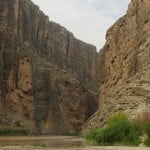 We besluiten om eerst een rustige fietstocht te maken naar de Boquillas Canyon. Vanuit onze ‘village’ RV park leidt een 15 kilometer lange golvende asfaltweg ons er naartoe. We vertrekken vroeg, dan zijn we de warmte voor. Vannacht heeft het enorm geonweerd, de eerste regen in maanden. Het gevolg is een kraakheldere lucht. Als we bij het begin van het wandelpad zijn, dat ons naar de canyon brengt, ontdekken we dat we het fietsslot zijn vergeten. Dus slepen we de fietsen een eindje omhoog en leggen ze in een kuil. Hopelijk liggen ze er straks nog. Via een rotsachtig pad lopen we verder richting de Rio Grande rivier. Aan de overkant ligt Mexico. Een Mexicaanse man zingt ons toe, hij heeft aan de Amerikaanse kant, onze kant dus, busjes neergezet waar we geld in mogen doen. Ook verkoopt ie wat prullaria. Als we dat zouden kopen dan hangt ons een grote geldboete boven het hoofd, geregeld staan er borden, met waarschuwingen. Ook border control via helikopters en checkpoints zijn we tot nu toe ook geregeld onderweg tegen gekomen. Even terug nu naar die Mexicaan. Voor The Voice hoeft ie zich niet op te geven, want het klinkt gewoon vals. Door de steile rotswanden galmt het geluid met ons mee, we zingen zijn deuntje mee, met andere teksten weliswaar. We wandelen verder de kloof in, eten een meegebracht boterhammetje met peanutbutter. Al etend kijken we tegen de enorme wand aan die de Rio Grande in vroeger tijden hier heeft uitgesleten. Als we weer terug de canyon uitlopen komt er een groep dikke Amerikanen ons tegemoet gepuft. Ze hebben de fietsen ongemoeid gelaten, hoe kan het ook anders.