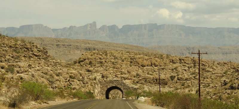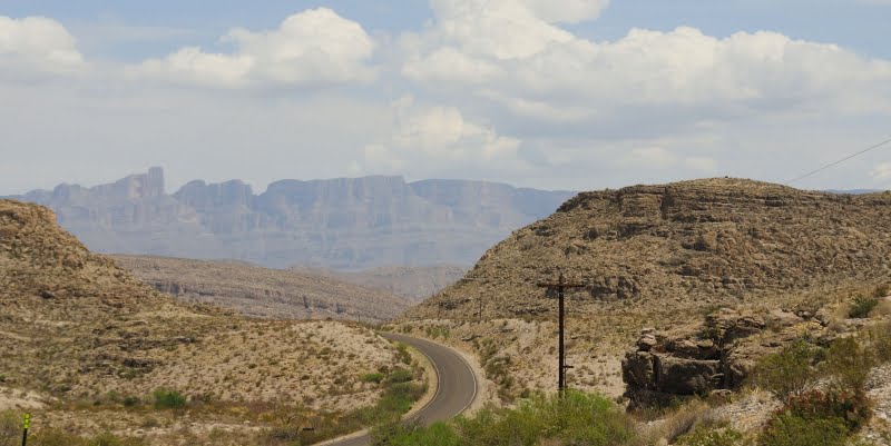 De naam Big Bend dankt het park aan de enorme bocht die de grensrivier de Rio Grande hier maakt. De Spanjaarden noemden het Despoblado, leeg land. Dat hadden we zelf niet beter kunnen bedenken. Aan de andere kant is leeg een relatief begrip. Er gaat een rijke fauna en flora verscholen achter de kennelijke monotoonheid. We hebben dan ook nog eens geluk. Veel planten en cactussen staan in bloei, en dat doen ze maar een paar weken per jaar. En bergen met pieken tot 2400 meter zie je toch ook niet over het hoofd. Warm wordt het wel in de middag. Voor de middelbaren onder ons, de hier levende handelaar in runderen, Don Milton Faver, heeft model gestaan voor de eens populaire westernserie Rawhide. Dus vermoedelijk eten we vanavond bonen (beans). Deze laatste wordt alleen begrepen door de adepten van de serie. In de tijd van de dinosaurussen was het voor mensen hier ook gevaarlijk, maar dan vanuit de lucht. Hier leefde de Gargantuan Pterosaur een vliegend reptiel met een spanwijdte van 15,5 meter. Bijna twee keer zo groot als onze camper. Er zijn in de park nog resten gevonden, die we hebben bekeken. Beginner