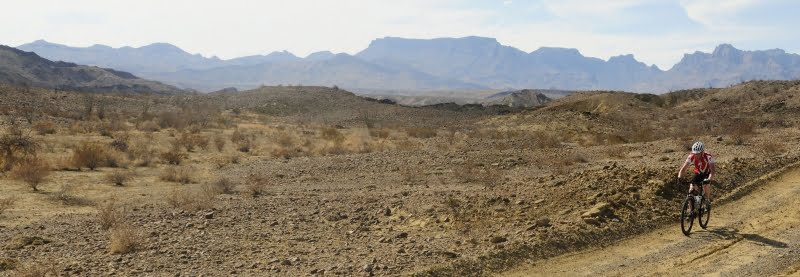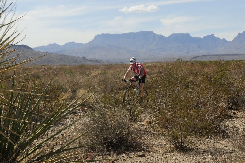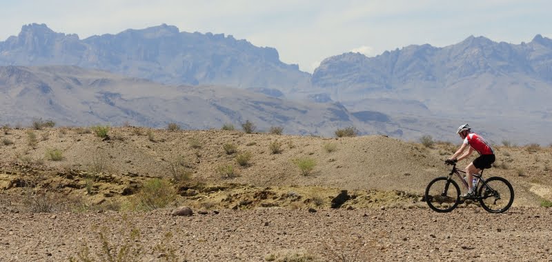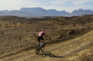 Met wat pijn in het hart laat ik Ingrid onder ‘haar’ boom bij de camper achter. De trail roept als een sirene naar Odysseus. Het is het warmste moment van de dag en de thermometer wijst in Fahrenheit het equivalent van 34 graden aan. Maar met ‘slechts’ ongeveer 65 km voor de boeg kan dat het probleem niet zijn. Twee volle bidons meenemen dan maar. En natuurlijk de fotorugzak. Die heb ik nog nooit gewogen, maar dik tien kilo is het zeker. Na een kilometer of 6 over de verharde weg gaat het linksaf de dirt road op. Die heet River Road East. Het is om te beginnen één lang wasbord. Niet echt prettig voor de billen, maar hij rolt niet slecht. Tenminste de eerste kilometers niet. Dan verandert de trail geleidelijk. Steeds meer grind waar de wielen zo lekker in wegzakken. Steeds is er een beetje meer energie nodig om vooruit te komen. Ook begint de weg langzaam te klimmen. Toch voel ik mij ontzettend happy. Een volwassen man die op zijn mountainbike door een woestijnlandschap mag raggen dat een landschapsarchitect niet mooier aan had kunnen leggen. Gelukkig heb ik een computer op mijn fiets, anders had ik gedacht dat ik al veel eerder bij de afslag naar de Glenn Spring Road had moeten zijn. De 15,5 km had ik volgens mijn benen al 10 km geleden afgelegd. Glenn Spring moet een sadist zijn geweest. Anders was deze road vast niet naar hem genoemd. Venijnige klimmetjes en kilometerslang diepe gravel. Recht vooruit ligt de 2301 m hoge Casa Grande met daarnaast Pummel Peak (2018 meter). Hoe ik ook mijn best doe, Pummel komt maar niet dichterbij. Wat wel dichter bij komt is het einde van mijn watervoorraad. Met nog een halve bidon te gaan, is het tijd om te rantsoeneren. Dat is schrikken, want nog meer dan de helft van de tocht ligt nog voor de wielen. Op de volgende bult komen de zorgen opzetten. De weg slingert oneindig in de verte en in de hoogte. De zon brandt onbarmhartig en het woord schaduw is hier onbekend. Ik ploeter verder. Af en toe schiet er een koude rilling door mijn lijf en komt er een licht zweverig gevoel opzetten. Dat is niet goed. Helemaal niet goed. Toch maar gaan drinken dus? Wat is wijsheid? Iedere mijl een klein slokje is het besluit. Maar één mijl duurt lang als de computer snelheden onder de 10 km per uur aangeeft. Niet opgeven, niet opgeven, trappen, trappen, trappen motiveer ik mijzelf. Bij de weg naar Juniper Canyon een kleine pauze. Nog 10 km naar de hoofdweg. Als je hier neervalt hoef je voorlopig niet op hulp te rekenen. Deze dirtroads worden door geen toerist gebruikt. Het is wachten op een ranger. Aan het einde van mijn latijn kom ik bij de hoofdweg aan. Nog 34 km terug. Gelukkig weet ik dat de weg op het laatste stukje na alleen vals plat naar beneden loopt. Maar dan helpt de wind weer niet mee. Die staat vol in het gezicht. Rustig trappend en enigszins gekoeld door de wind bereik ik Rio Grande Village.