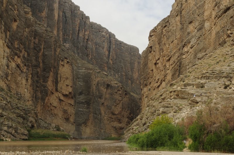 We besluiten om eerst een rustige fietstocht te maken naar de Boquillas Canyon. Vanuit onze ‘village’ RV park leidt een 15 kilometer lange golvende asfaltweg ons er naartoe. We vertrekken vroeg, dan zijn we de warmte voor. Vannacht heeft het enorm geonweerd, de eerste regen in maanden. Het gevolg is een kraakheldere lucht. Als we bij het begin van het wandelpad zijn, dat ons naar de canyon brengt, ontdekken we dat we het fietsslot zijn vergeten. Dus slepen we de fietsen een eindje omhoog en leggen ze in een kuil. Hopelijk liggen ze er straks nog. Via een rotsachtig pad lopen we verder richting de Rio Grande rivier. Aan de overkant ligt Mexico. Een Mexicaanse man zingt ons toe, hij heeft aan de Amerikaanse kant, onze kant dus, busjes neergezet waar we geld in mogen doen. Ook verkoopt ie wat prullaria. Als we dat zouden kopen dan hangt ons een grote geldboete boven het hoofd, geregeld staan er borden, met waarschuwingen. Ook border control via helikopters en checkpoints zijn we tot nu toe ook geregeld onderweg tegen gekomen. Even terug nu naar die Mexicaan. Voor The Voice hoeft ie zich niet op te geven, want het klinkt gewoon vals. Door de steile rotswanden galmt het geluid met ons mee, we zingen zijn deuntje mee, met andere teksten weliswaar. We wandelen verder de kloof in, eten een meegebracht boterhammetje met peanutbutter. Al etend kijken we tegen de enorme wand aan die de Rio Grande in vroeger tijden hier heeft uitgesleten. Als we weer terug de canyon uitlopen komt er een groep dikke Amerikanen ons tegemoet gepuft. Ze hebben de fietsen ongemoeid gelaten, hoe kan het ook anders.