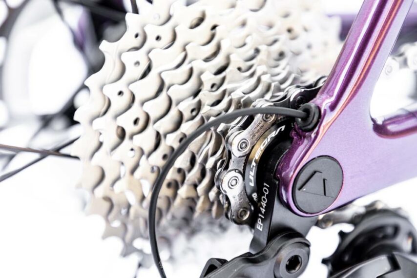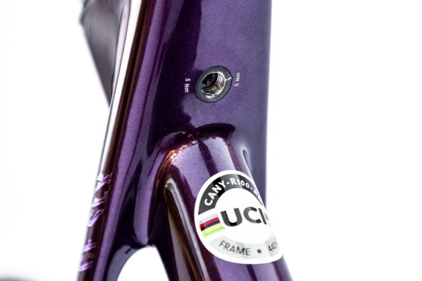 Léon: “Mijn paarse testfiets staat op me te wachten bij het Canyon Servicecentrum in Eindhoven. Het eerste dat me opvalt, zijn de geïntegreerde cockpit en weggewerkte kabels – dat laatste mocht ook wel een keer. De fiets ziet er prachtig uit. Deze iced berry-lak is prachtig: half mat, half glanzend, opvallend, maar niet schreeuwend. De lijnen kloppen en esthetisch gezien oogt de fiets mooi in balans.“