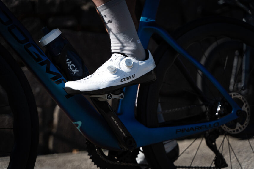 De aluminium pedalen (dat materiaal is een duurzame keuze, aldus het merk zelf: bij een valpartij gaat een pedaal als eerste kapot) komen exclusief uit met de nieuwe Q36.5 Unique Pro Shoes. Ik heb ze twee dagen getest tijdens een trip naar Italië en vond ze heerlijk zitten. Q36.5 zegt dat de stackhoogte van de schoenen in combinatie met Shimano-pedalen gemiddeld 17,8 millimeter bedraagt en met de Q36.5-schoenen slechts 11,9 millimeter.
