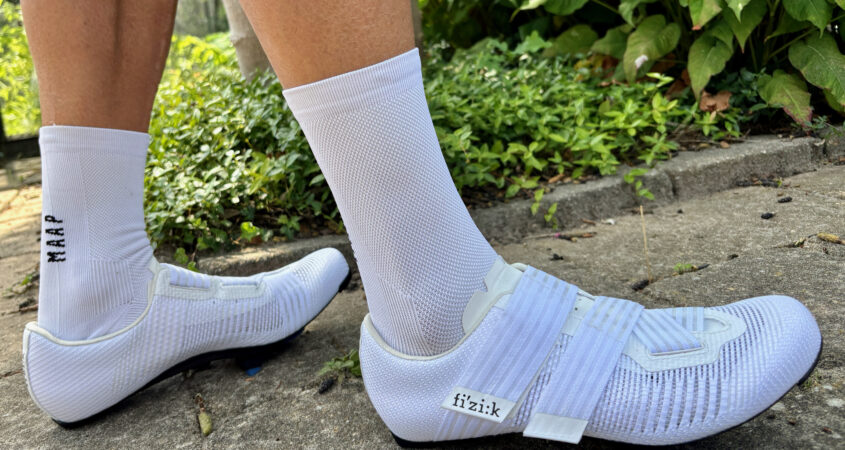 Zit je in kamp BOA, veter of klittenband? Zelf zou ik voor BOA kiezen, simpelweg omdat ik de meeste van mijn kilometers wegtrap op schoenen met een dubbele BOAsluiting. Maar nu heb ik voor het eerst zo’n driehonderd kilometer gefietst op een ‘klittenbandschoen’: de Vento Powerstrap Aeroweave van Fizik met een prijs van 350 euro. Aeroweave verwijst naar de stof van het bovenwerk van de schoen, die gemaakt is van geweven nylonvezels. Dit materiaal maakt dat dit hun meest ademende schoen tot nu toe is, die slechts 184 gram weegt (per schoen). Ze zijn voorzien van een carbon zool met een stijfheidsindex van 10 op 10.