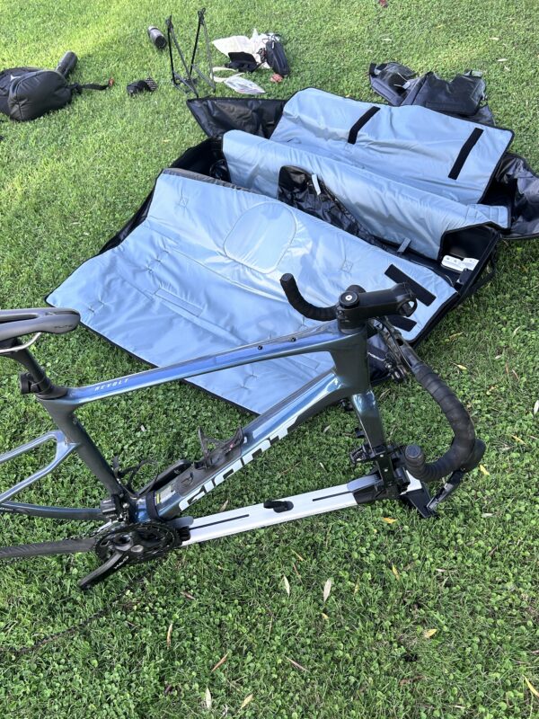 Niks te verbeteren? Nou, de lange ritssluitingen maken onderaan een bochtje, dat gaat altijd wat minder soepel dat wanneer zo’n rits in een rechte lijn loopt. En de tas weegt 12,5 kilo. Als je daar het gewicht van je fiets bij optelt, tikt dat behoorlijk aan als je maar 23 kilo mee mag nemen. Ik liet de buizen voor de werkplaatsstandaard daarom thuis, kon ik in plaats daarvan mooi wat gereedschap en fietsschoenen in de tas stoppen, want daar was nog zat ruimte voor. De Thule Roundtrip kost 799,99 euro en er is ook een model voor de MTB.