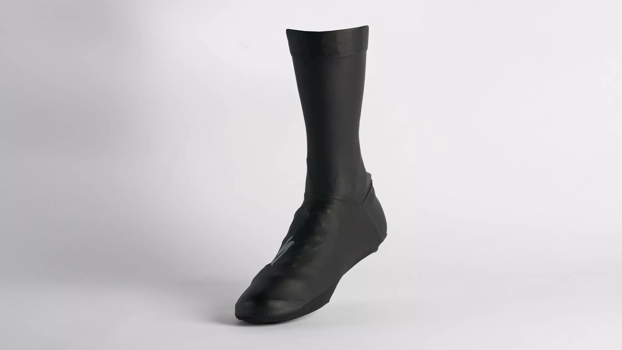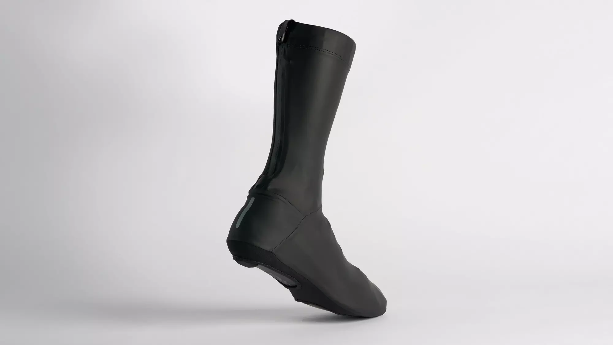 Specialized maakt niet alleen fietsen, ook hun kledingen accessoires-collecties zijn goedgevuld. Deze Rain Shoe Covers, regenoverschoenen in goed Nederlands, zijn ontzettend hoog. Zelfs met mijn lange benen komen ze makkelijk tot halverwege mijn kuiten. Dat is fijn, want zo krijgt opspattend water minder kans om langs de bovenkant toch naar binnen te sijpelen. Dat is ook de enige plek waar je je druk om hoeft te maken, want verder zijn ze volkomen waterdicht.