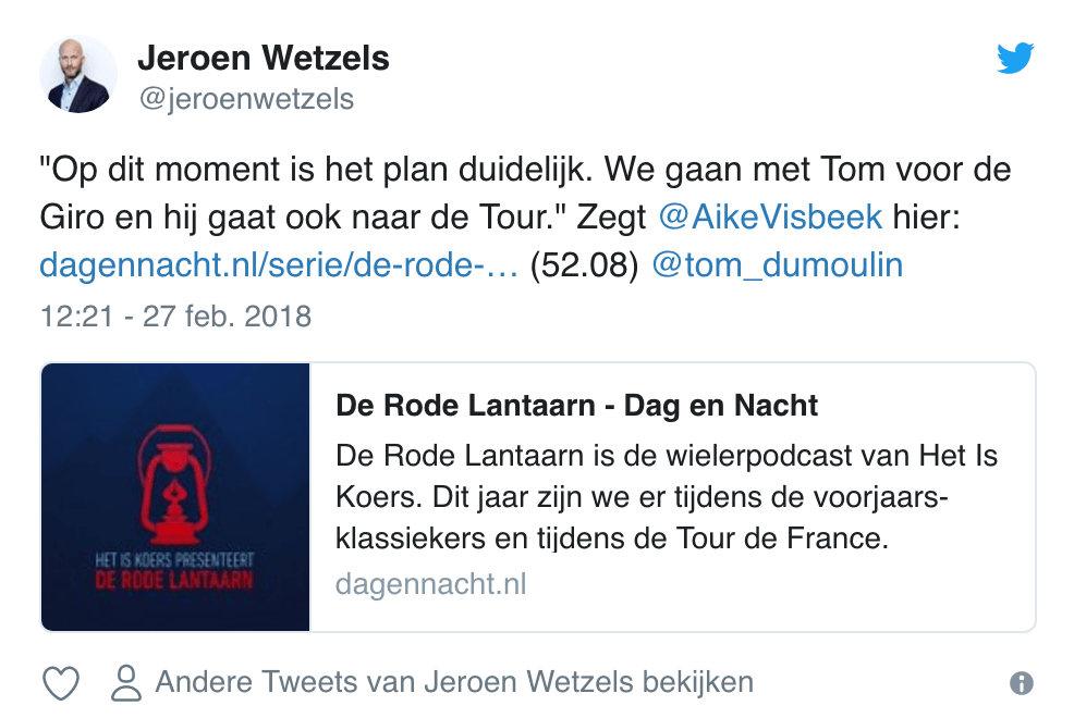 In het gesprek geeft Aike aan: ”Het plan is duidelijk. We gaan met Tom voor de Giro en hij gaat ook naar de Tour.” Hij voegt toe: ”Tom Dumoulin gaat de Tour winnen, dat hopen we toch allemaal?”.