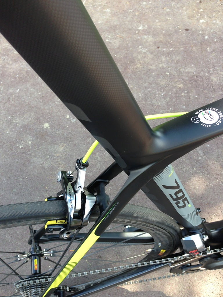 Een lust voor het geoefende oog. Je kunt blijven kijken naar de 795. En je vind hem mooi of echt niet mooi. Hoe rijdt dat nou? Eigenlijk net zo spectaculair als dat die er uitziet! De fiets die wij mee kregen -een Light met Dura-Ace Di2- voor een paar ’tours’ op een nogal populair trainingsrondje in Parijs – het fietspad rond de Longchamps paardenrenbaan (!)- maakte eerst en vooral nogal wat geluid. Deels door het rauwe asfalt, de hoge Mavic velgen en de binnendoor lopende kabels. Een vrolijke klankkast als het ware! Lekker! Daarnaast bleek de 795 een zeer reactieve fiets: gaf je een ‘ruk’ aan het stuur dan reageerde de 795 alsof die door een wesp werd gestoken. Het is duidelijk geen ‘toer’ fiets. Ja, wel comfortabel genoeg door de E-Post, maar de hele bouw en geometrie is echt gericht op ‘performance’. Oneerbiedig: ‘Gaan met dat ding!’. We komen nog terug op de 795 in een van de volgende nummers van FIETS. Alvast twee richtprijzen: een 795 Light met Ultegra & Mavic zal rond de 5799 euro kosten, een 795 Aerolight met Ultegra & Mavic 6499 euro.