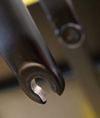 Het werkt zo: Je draait de snelspanner een klein slagje los, waarna je de steekas iets kunt terugtrekken. Daarna valt het wiel er simpel uit te halen. Dat kan doordat er in de vork aan de schijfkant een steekasgat zit, en aan de andere kant een uitvalpad. De foto’s maken het duidelijker. Mooi bedacht hoor, en er zit ook nog een “ingebouwde momentsleutel” in, waardoor je de Speed release altijd met de juiste kracht vastzet.