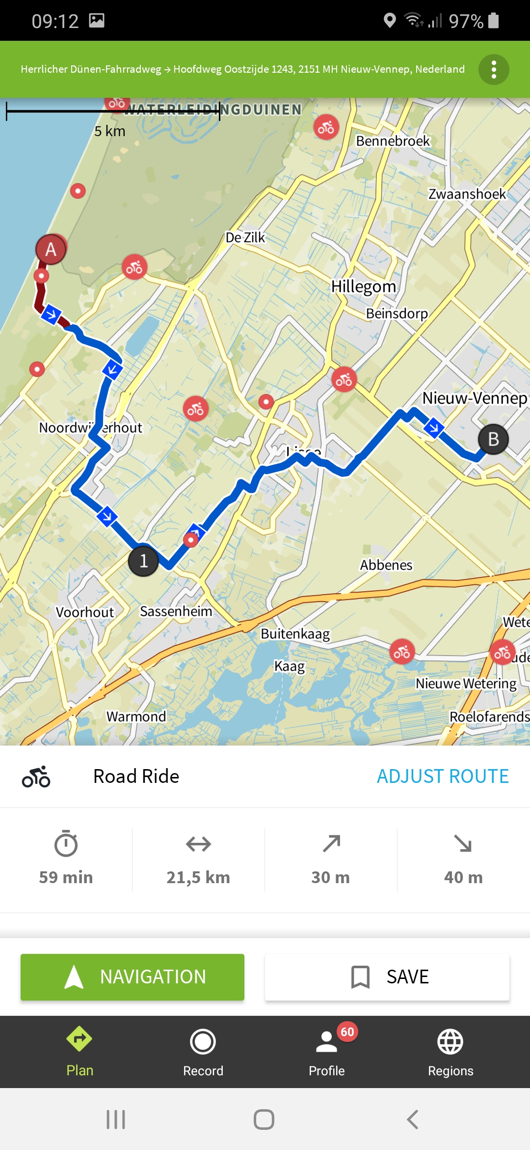 Een route maken in Komoot is echt kinderlijk eenvoudig. Je kiest een startpunt, dat kan door een adres in te voeren of een punt op de kaart aan te klikken. Vervolgens kies je op dezelfde manier een eindpunt en Komoot maakt in razend tempo een route voor je. Daarna kun je tussenpunten toevoegen als de door Komoot gekozen route niet helemaal naar je zin is. Dan kun je kiezen om te beginnen met navigeren, of om de route op te slaan voor later gebruik. Komoot bevat ook een heleboel bestaande routes die door andere gebruikers openbaar zijn gezet. Vaak met leuke foto’s van onderweg. Een prima manier om interessante fietsroutes te ontdekken in gebieden waar je zelf nog niet zo bekend bent.
