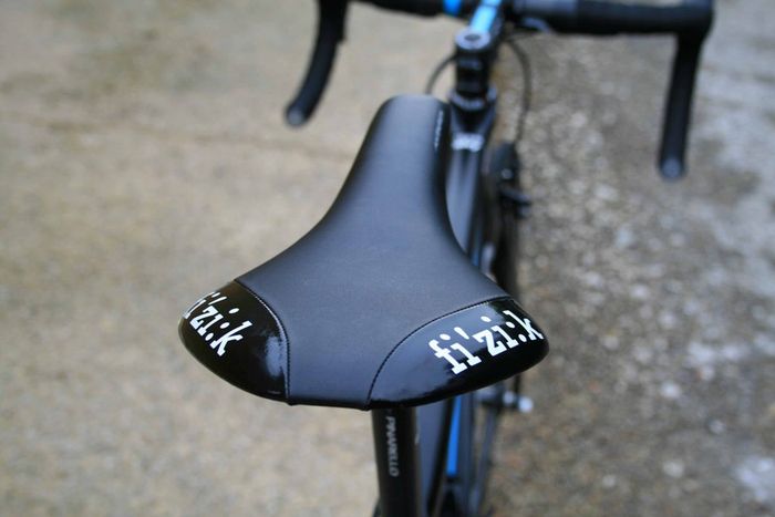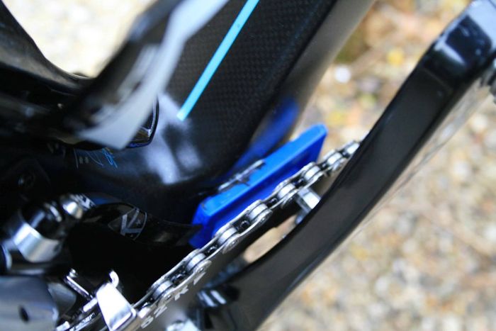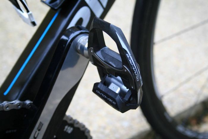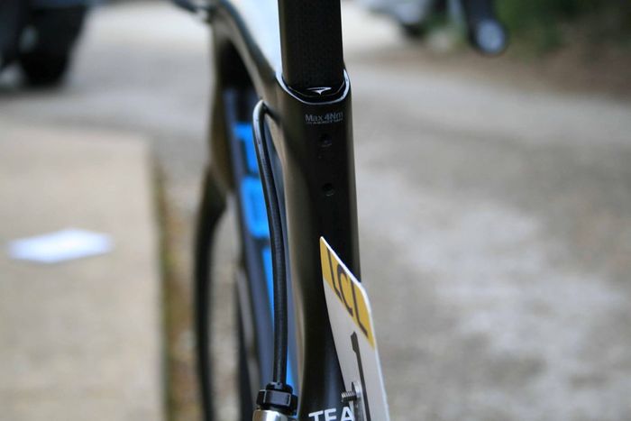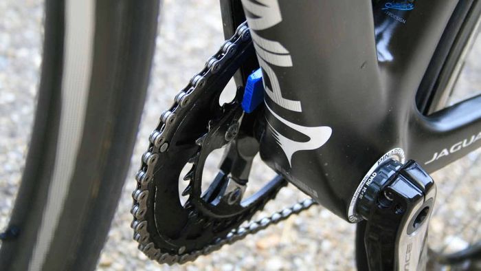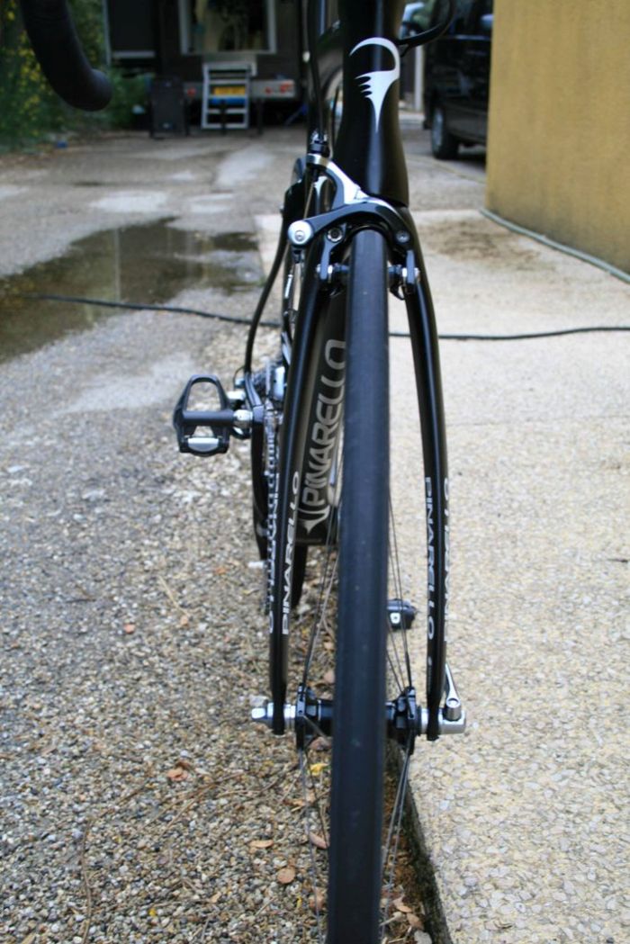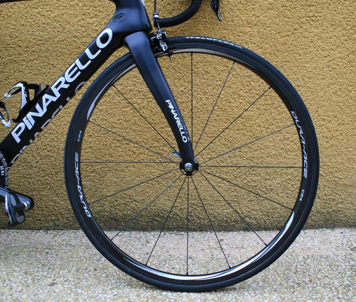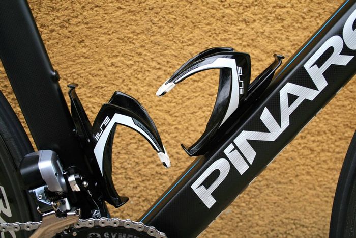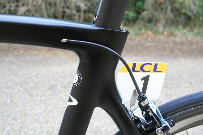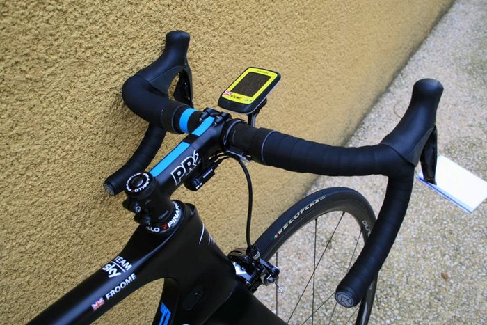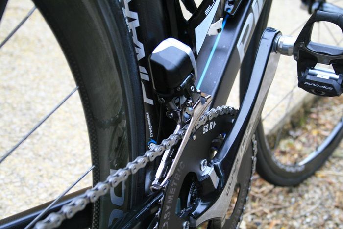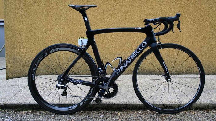 De nieuwe Dogma is een aero frame dat gemaakt is van zogeheten Torayca T1100 1k carbon. De vork lijkt te zijn overgenomen van de Pinarello Bolide, de tijdritfiets van de Italiaanse fietsenfabrikant. De kabels lopen binnendoor en uit aerodynamische overwegingen zijn er drie montagemogelijkheden voor de bidonhouder. Hoe lager de bidonhouder, hoe aerodynamischer de fiets. De geometrie van Froome’s fiets is gelijk aan die van zijn Pinarello Dogma 65.1. Froome blijft ook vasthouden aan zijn Osymetric ovale bladen. Wat verder opvalt is dat het beschermkapje van de extra schakelknopjes van de elektronische Shimano Di2 groep, is weggelaten. Ook is er een door de mecaniciëns bewerkte kettingvanger. De bestaande K-Edge kettingvanger die het team gebruikt, is niet geschikt voor ovale bladen. In FIETS nummer 6 staat een test van de Dogma F8.