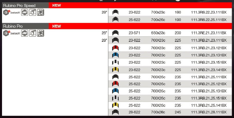 Nog wat getalletjes: de Pro Speed in 25 weegt slechts 190 gram! Rubino Pro in de drie verschillende breedte maten: 225, 235 en 245 gram. De nat weer band -Pro Control- is minder afgetraind maar ook op robuustheid ontworpen. Voor een 25 mm band stopt de weegschaal bij 320 gram.