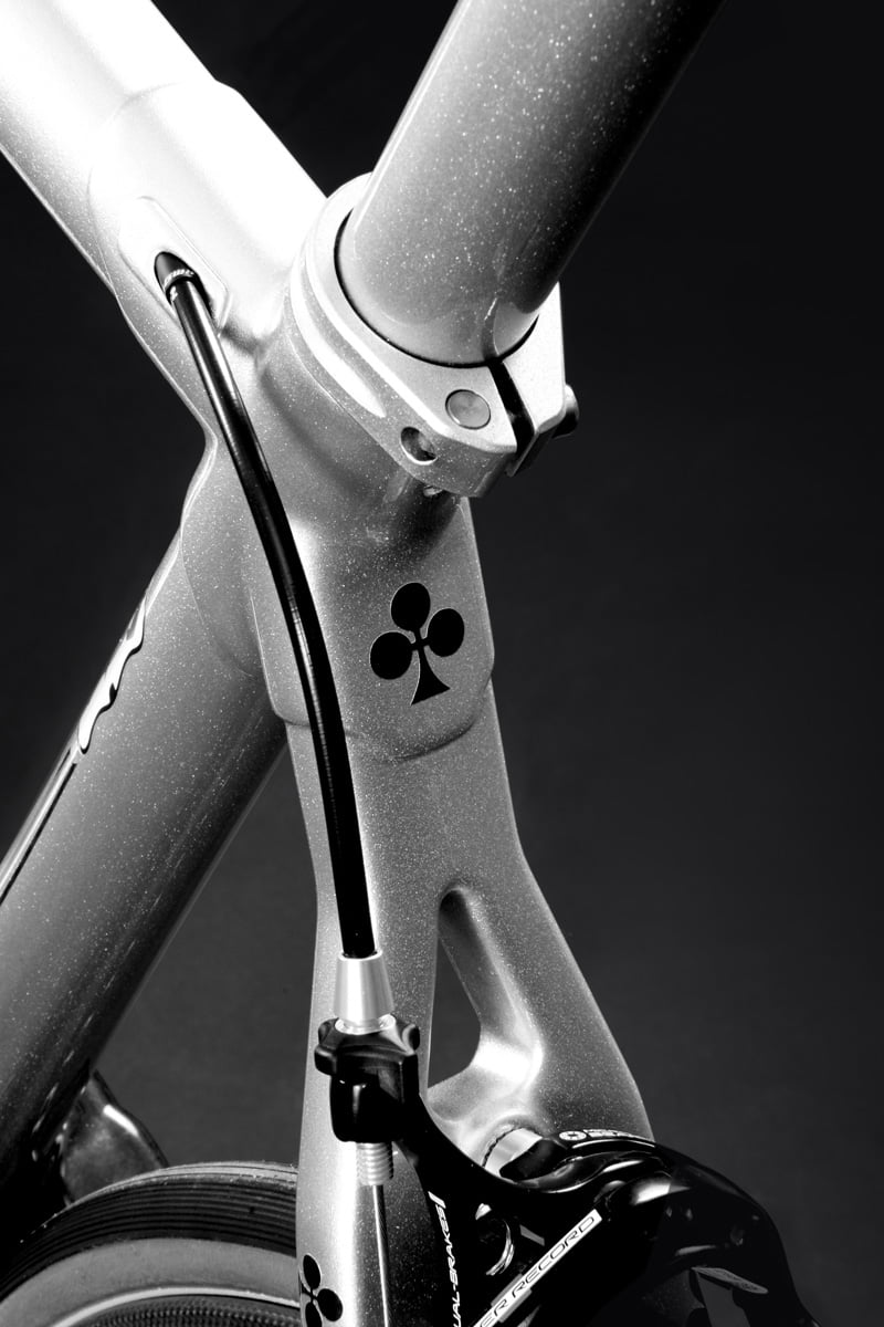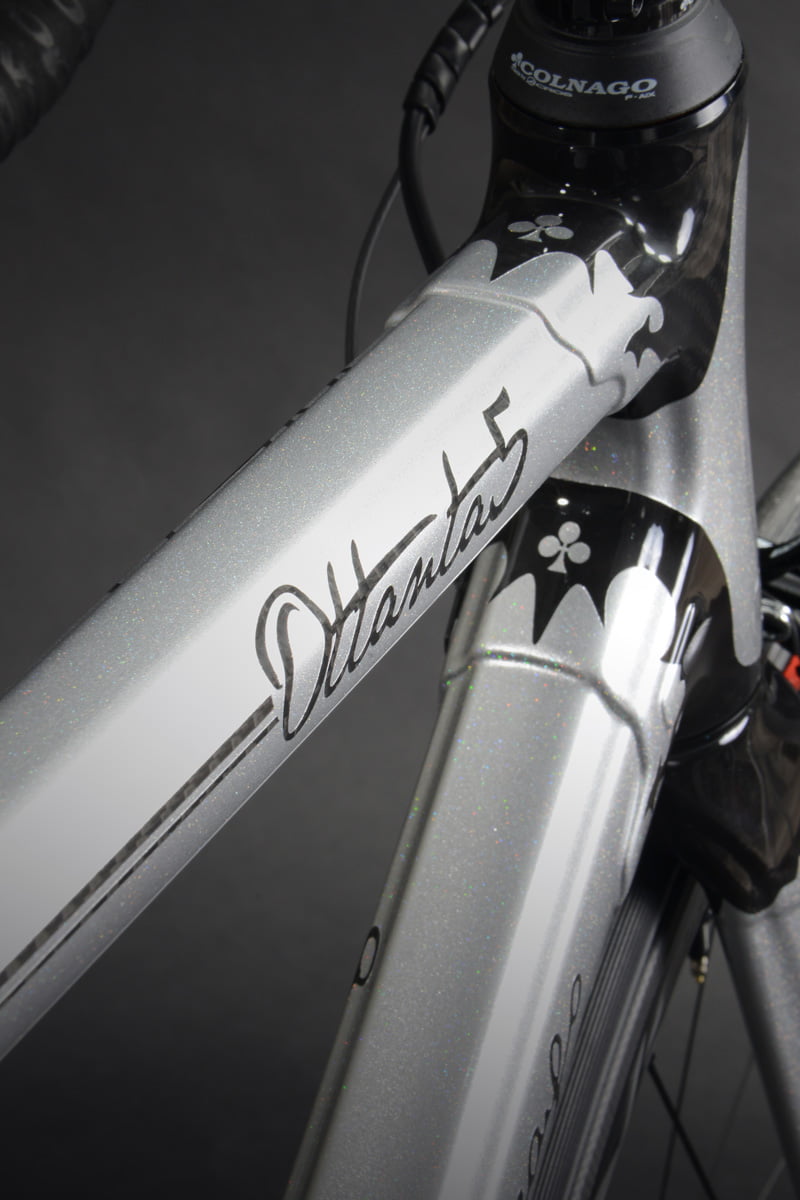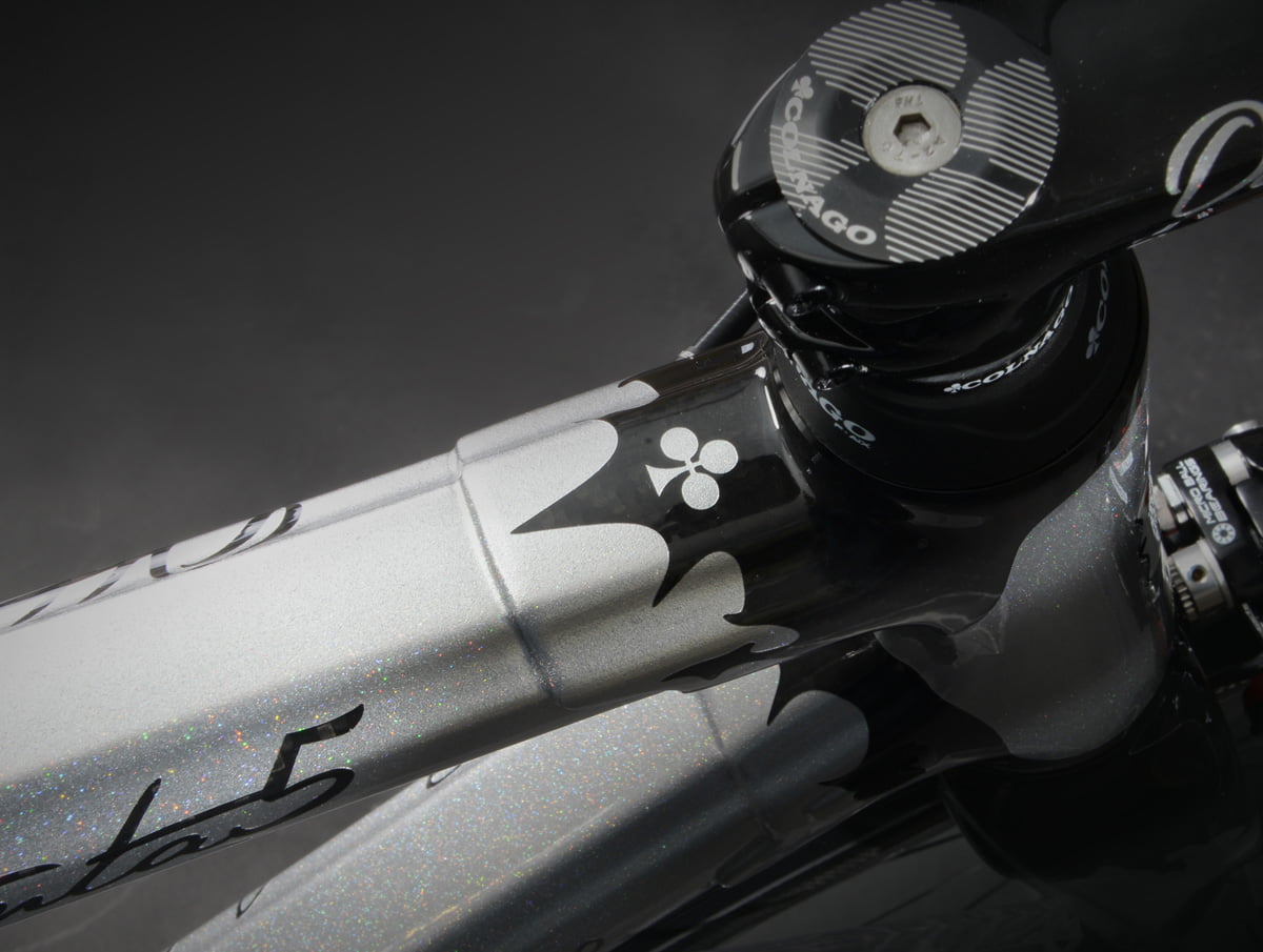 Ook het spuitwerk is met de hand gedaan. Met airbrush wordt er een zilveren metallic laag op het frame gespoten, afgemaakt met zwarte decoraties. Voor het logo op balhoofdbuis en zitbuis is teruggegrepen naar de eerste versie, uit 1954. De vind je de handtekening van Ernesto himself en de naam Ottanta5 terug op het mooie frame.