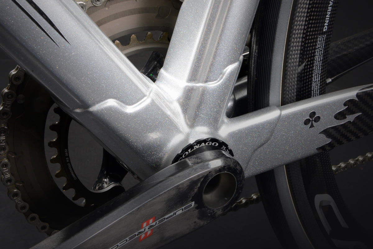 De Ottanta5 is gemaakt met de van de C60 bekende hoekige carbonbuizen en lugs. Maar dan in een wat dikkere maat, terwijl de wanddikte juist dunner is. Dat heeft geresulteerd in een fiets die niet zwaarder is, maar wel stijver. De lichtgewicht aluminium dropouts zijn voor deze C60 opnieuw ontwikkeld. Heel bijzonder is dat het frame beschikbaar is in maar liefst 19 maten! De fiets wordt afgemonteerd met een Campagnolo Ultra Bora wielset en de Super Record EPS groep van hetzelfde merk.