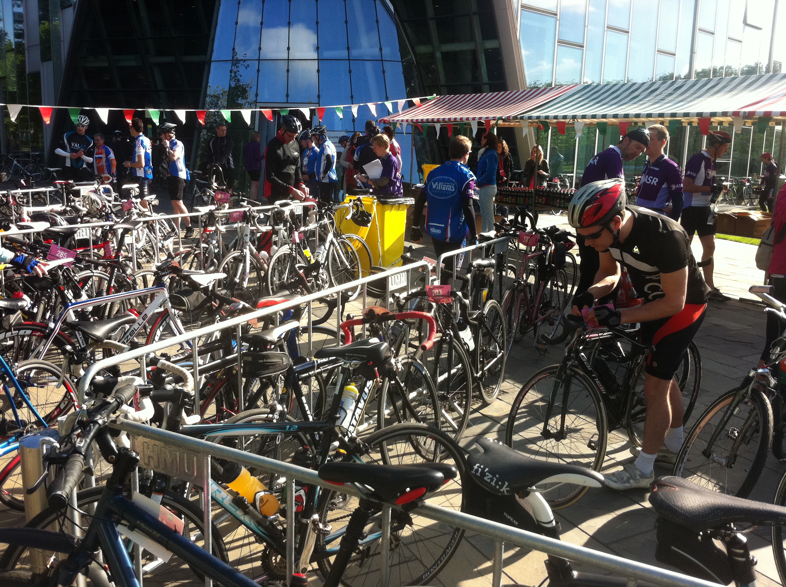 De ontvangst voor de bedrijventocht is vriendelijk: koffie, muffins en voor de tocht zelf: bidons met sportdrank, repen, bananen en broodjes. Zoals elk jaar is er voor iedereen een wielershirt. Grote maten als 3 en 5 XL gaan volop over de toonbank, ik kies voor een large. Shirtjes mogen niet wapperen tijdens het fietsen.