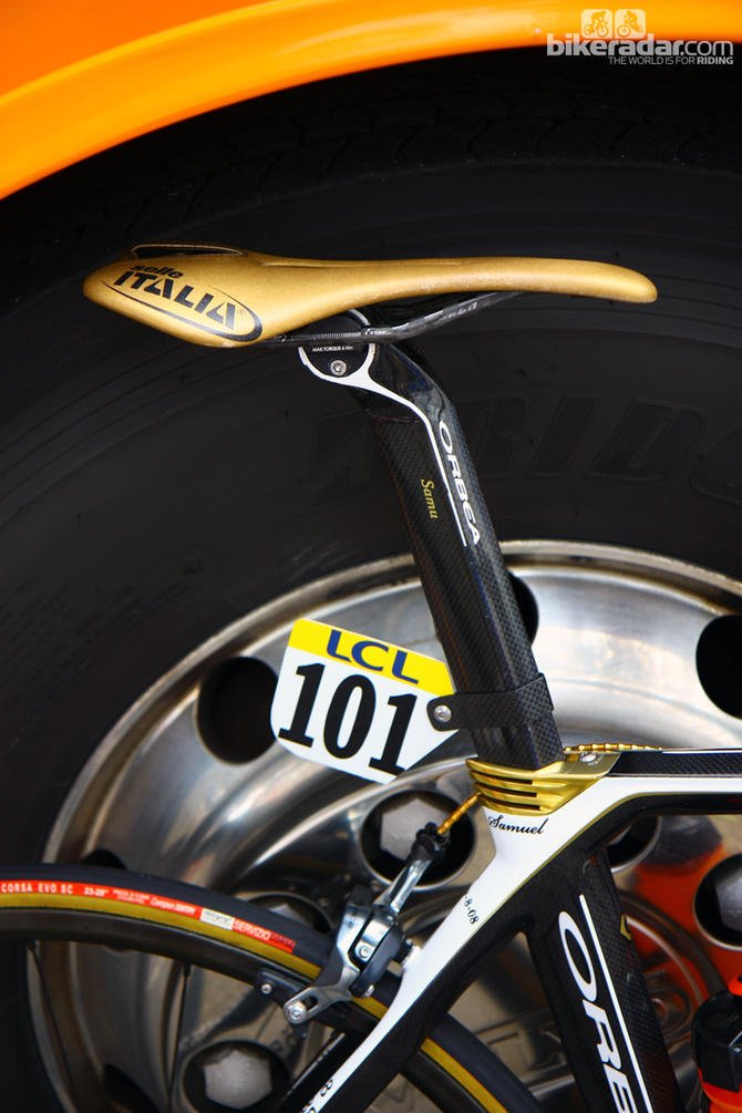 Meest in het oog springend zijn het gouden zadel en het gouden stuurlint. Ook het frame heeft accenten in deze kleur meegekregen. Goud is tevens terug te vinden op de remkabels, de shifters, de derailleur en de zadelklem. Zelfs de ketting op de Orbea Orca van Samuel Sanchez is goudkleurig.