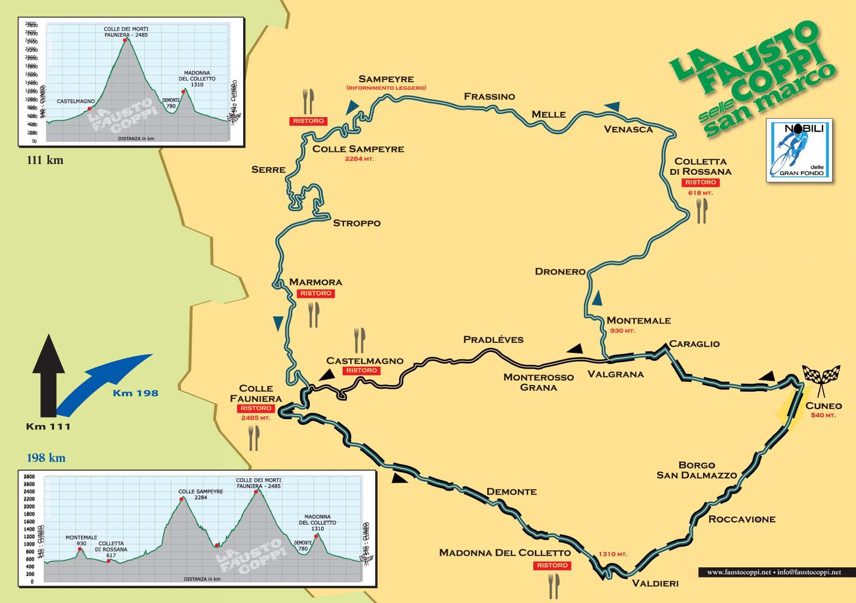 De inschrijving voor de Fausto Coppi cyclo is geopend. Tot en met 31 december kunnen deelnemers zich voor 35 euro inschrijven. Dat is 15 euro minder dan dat op de dag voor het evenement moet worden betaald. De ”Coppi” staat voor 7 juli 2013 op de kalender.Start en finish van deze cyclo is in Cuneo, in de regio Piemonte. Gemiddeld doen ongeveer 2000 mensen mee aan deze tocht. Zestig procent van de deelnemers komt uit Italie. De cyclo is 198 kilometer lang en telt 4300 hoogtemeters door de Alpen. De tocht gaat over de volgende bergen: Sampeyre 2284 m, Fauniera 2485 m,en Madonna del Colletto 1310 m. Komend jaar wordt de Fausto Coppi voor de 26-ste keer georganiseerd.