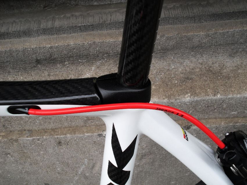 Opvallend is dus het Direct Drive Concept in combinatie met de A-Stem. Al eerder gezien bij de Look MTB’s, nu ook getransformeerd naar de racefiets. Een directe aansluiting van stuurpen op de voorvork en het frame. Geen spacers meer – op eentje na van 5 mm. Wel keuze uit drie stuurpennen die naar believen ‘omhoog’ of ‘omlaag’ gemonteerd kunnen worden. Onderin het balhoofd rust een 1. 5 inch lager, boven een 1 1/8 inch.
