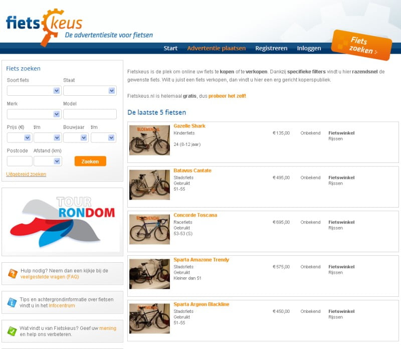 Fietskeus.nl hoopt hier uitkomst te bieden; specifieke filters voor juist datgene wat jij belangrijk vindt. Bij zowel het plaatsen van een advertentie als bij het zoeken naar een fiets wordt snel duidelijk wat de bedoeling is. Wanneer het soort fiets is aangegeven (bijv. race of mtb), verschijnen er verschillende uitgebreide filters die het makkelijker maken om een fiets te kopen of verkopen.