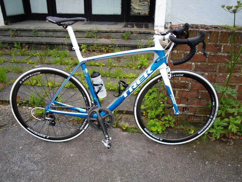 Gisteren al het nieuws over de nieuwe Madone 7-series, vandaag een korte testrit met de nieuweling. Nou ja, niet de ‘7’, wel de ‘6’. Maar de 7 en de 6 hebben meer overeenkomsten dan verschillen. Wat maakt deze Madone de ‘new Madone’? Was de ‘oude’ Madone vooral heel rond en geovaliseerd, de nieuwe ‘7’ is een echte aerodynamische ‘road racer’. Het frame is volgens de KVF (Kammtail Virtual Foil) ontworpen. Weinig ronde vormen, eerder druppelvormig en driehoekig. Het meest zichtbaar is dit in de balhoofdbuis, de overgang tussen balhoofdbuis en de boven- en onderbuis en de overgang van de bovenbuis naar de staande achtervork.