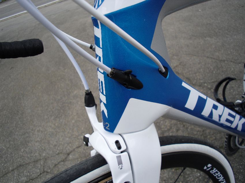 Maar echt opvallend is de plaats van de achterrem: niet meer op de staande achtervork, maar onder het bracket. Daar, waar je de rem ook vaak ziet bij een tijdritframe. De voorrem is ook meer geïntegreerd als voorheen; in de KVF voorvork uiteraard. 25 watt krijg je er ‘gratis’ bij volgens Trek. Gebleven zijn de BB 90 bracket en de ‘ride tuned’ zadelpen.