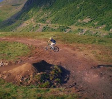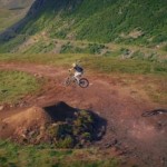 Video van een singletrack langs een prachtige kust . Nico Zink wordt gefilmd door een camera aan een 500 meter lange kabel.