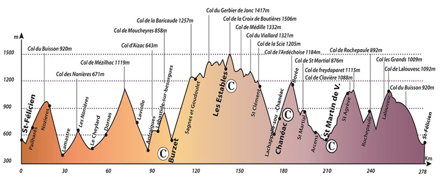 Ronald reed daar eerste een paar dagen warm om vervolgens de Ardechoise te fietsen. Een tocht van 278 kilometer, met zestien cols en 5370 hoogtemeters. Die is het hele jaar uitgepijld met bordjes langs de weg en gele pijlen op het asfalt en kun je daarom prima op eigen gelegenheid rijden. Mits je conditie dat toelaat natuurlijk!