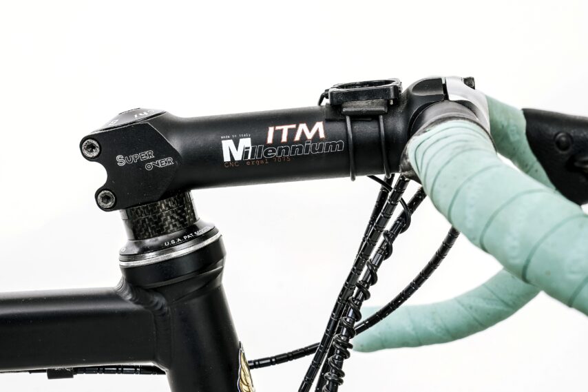 De fiets is gespoten in een mix van zwart en het welbekende celeste. Ullrich had een speciale uitvoering: de XL EV4. Gemaakt van ‘hyper-alloy’, megalicht aluminium, en dus nog net wat lichter dan de EV3. De fiets van Ullrich was op maat gebouwd, met een staande buis van 56,5 centimeter en een bovenbuis van 58 centimeter. Voeg daar de 14(!) centimeter lange ITM stuurpen aan toe en je kunt gerust zeggen dat Jan plat op z’n vliegmasjien lag.