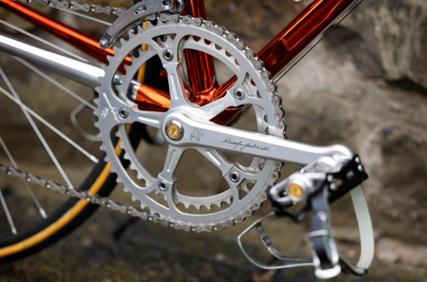 Toen het onderdelenmerk in 1983 vijftig jaar werd, vierden de Italianen dat met een jubileumuitvoering van de Super Record-groep. Aluminium onderdelen met gouden accenten, veel gravures, mooi in een doos inclusief pedalen, zadelpen en naven (tegenwoordig ‘doet’ zo’n doos rond de 3500 euro). Uiteraard bestelde Salden zo’n groep. Maar die bleef vervolgens jaren onaangeroerd liggen in het magazijn. Tot de Superleggera binnenkwam – daar zou de groep perfect bij passen. Ombouwen dus. Alleen bleek dat nog wel wat voeten in de aarde te hebben. Er moesten andere wielen in met de correcte naven. Die werden in Groot-Brittannië gevonden, maar als gevolg van de Brexit werd het versturen een slepende kwestie en moest er een flik bedrag aan invoerrechten betaald worden: zo’n 600 euro.