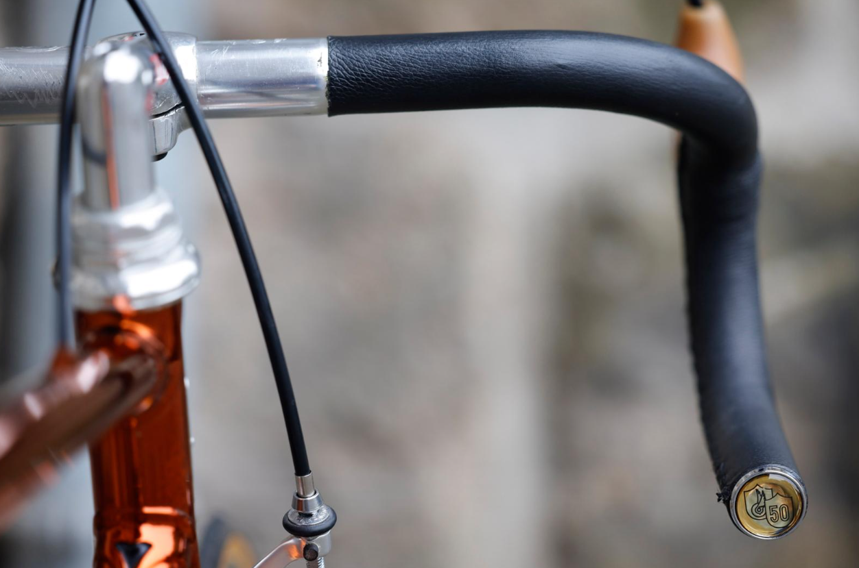 Maar inmiddels, bijna twee jaar nadat de Superleggera in Limbricht aankwam, heeft Salden hem af: compleet met 53/42-crankstel, 6-speed 13-26, Mavic GP4-wielset met Challenge Criterium-tubes, Iscaselle Giro d’Italia-zadel, gestikt lederen stuurlint en een superexclusief Silca-pompje, en (uiteraard, zouden we bijna zeggen) uitgevoerd in de kleur ramato. In totaal is de fiets 9,68 kilo zwaar. Als je goed kijkt, zie je dat de koperen finish her en der wat dun is geworden – als je heel dichtbij komt, zie je zelfs wat craquelé.