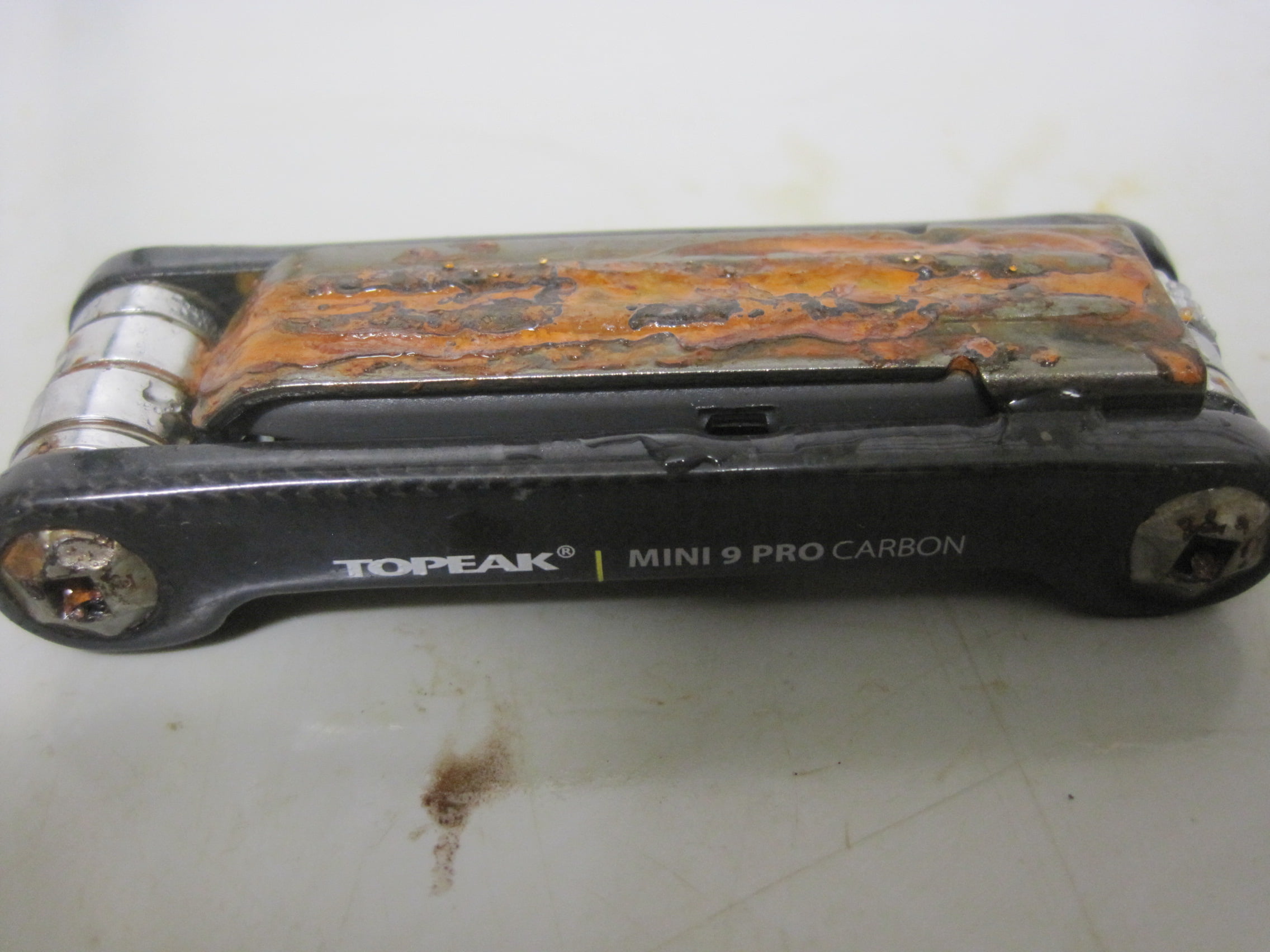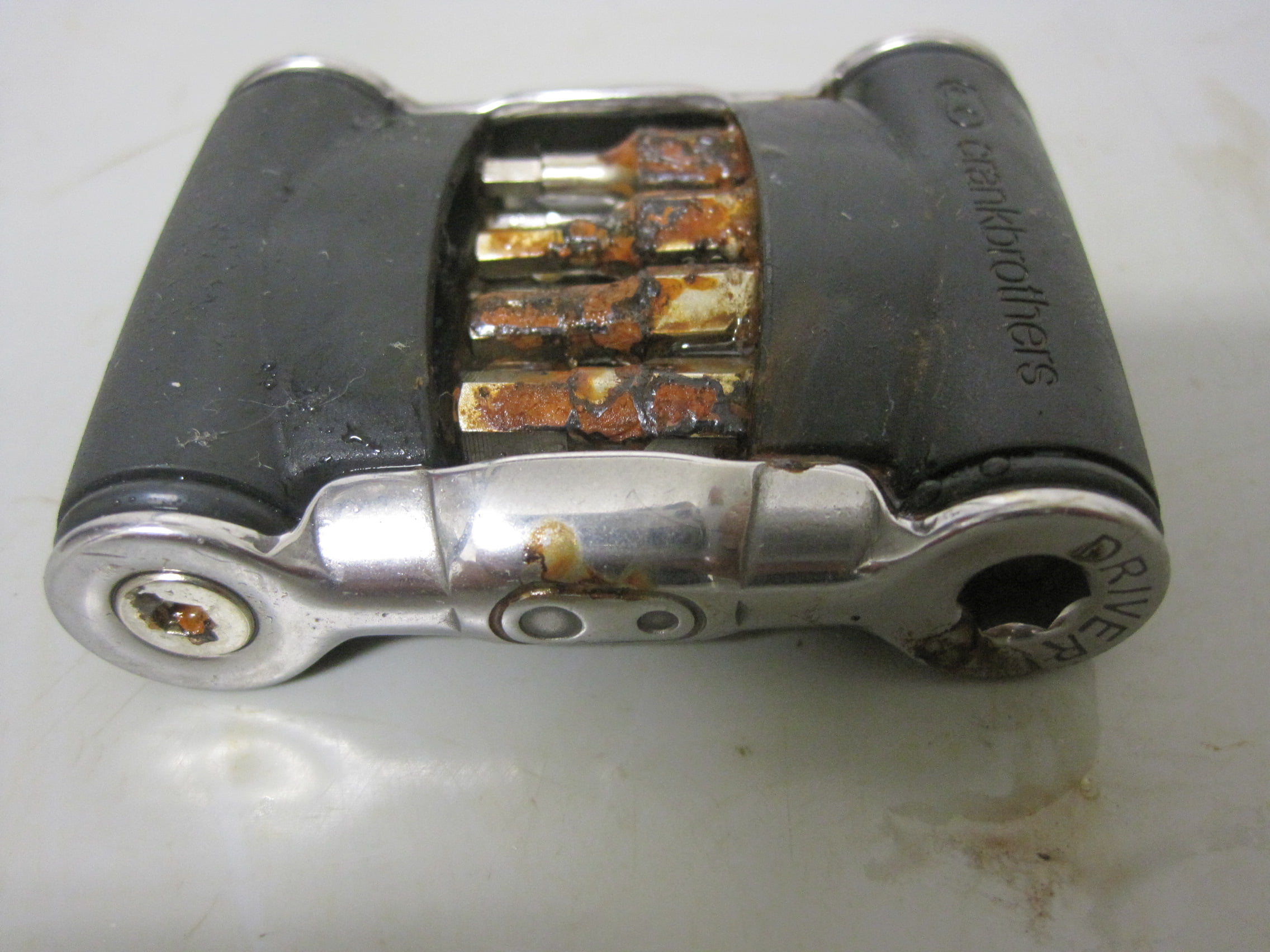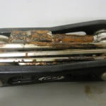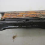 In Fiets nr.9 -2015 testten we minitools. Onderdeel van de test was het kijken wat er met de tools zou gebeuren na 96 uur in een weerkamer. In de foto’s hieronder zie je hoe snel het kan gaan. Vergelijkbaar met een seizoen in een ‘niet waterdichte’ zadeltas.