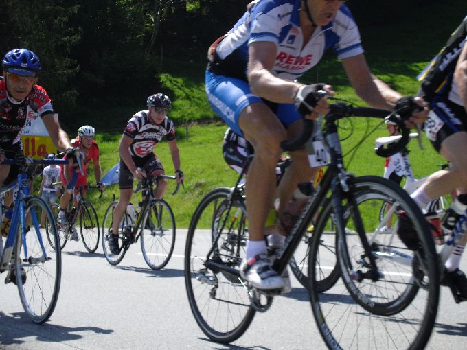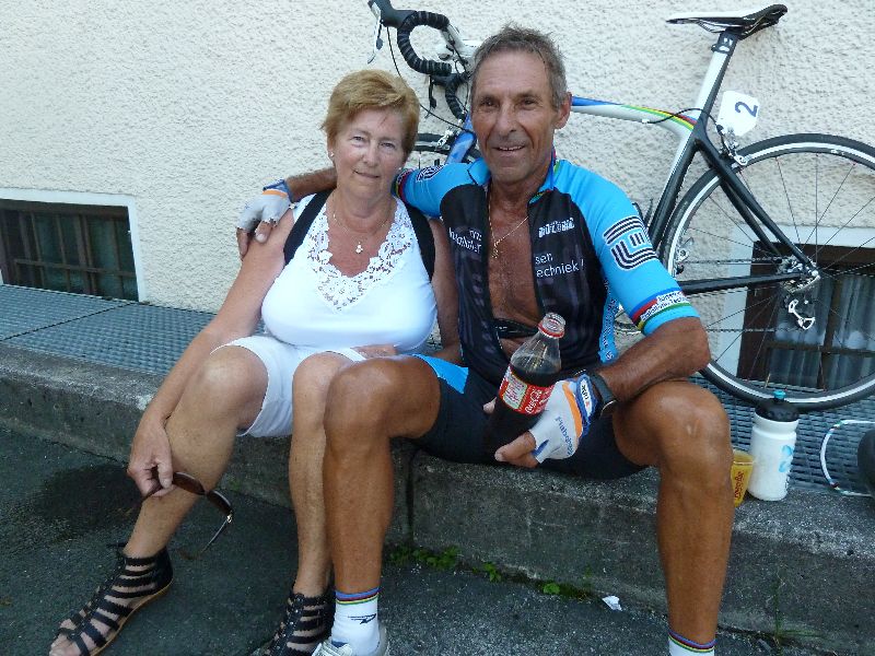 Theo Mook, 69 jaar. Voor de vijfde keer eerste in St. Johann. En dat terwijl hij in 2009 een hartaanval kreeg’. Op 15 juli. ‘Bijna was ik er niet meer. Ik heb een jaar gerevalideerd en rustig aan weer begonnen. Nu is alles weer in orde. Laatst trapte ik 350 watt weg bij een test in het ziekenhuis. Ik slik nog bloedverdunners en cholesterol pilletjes’. Volgend jaar wordt hij 70 jaar. Stoppen? ‘Iedereen om me heen zegt dat het beter is om te stoppen. Maar ik doe het te graag. Daarnaast verbied de dokter het niet. Het is ook mijn eigen keuze. Ik ben wel zuiniger gaan fietsen. Ik ben ook een sprinter, dat scheelt he. Ik kan me goed plaatsen en ik heb nog veel snelheid’. En zo won hij de wedstrijd dan ook op vrijdag.