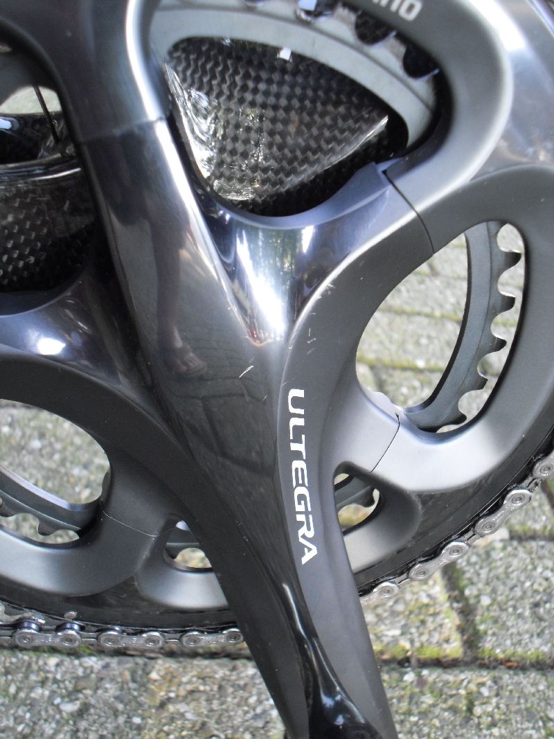 Wat zorgt voor slijtage? Schurende wielerschoenen op een crankstel uiteraard, troep aan de onderzijde van de remmen – onder het grijs zit ‘gewoon’ blank aluminium. We hebben een aanrijding met een verkeershek gehad wat een paar krasjes – zie foto- op het crankstel opleverde. Niet fijn, maar geen echt probleem. Is ook niet veel aan te doen; wellicht wat grijze lak zoeken en aanbrengen mochten de krassen (te) groot zijn. Op ‘donker’ aluminium zie je wel eerder een kras dan op blank alu –en daar kun je die eventueel nog weg polijsten. We hebben de onderdelen al op een aantal complete racefietsen gespot. En door de donkere kleur krijgt een racer net wat meer uitstraling. Dat wil zeggen: zolang het frame maar niet te ‘licht’ dan wel te ‘donker’ is. Uiteraard is dit een kwestie van smaak.