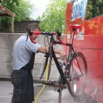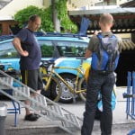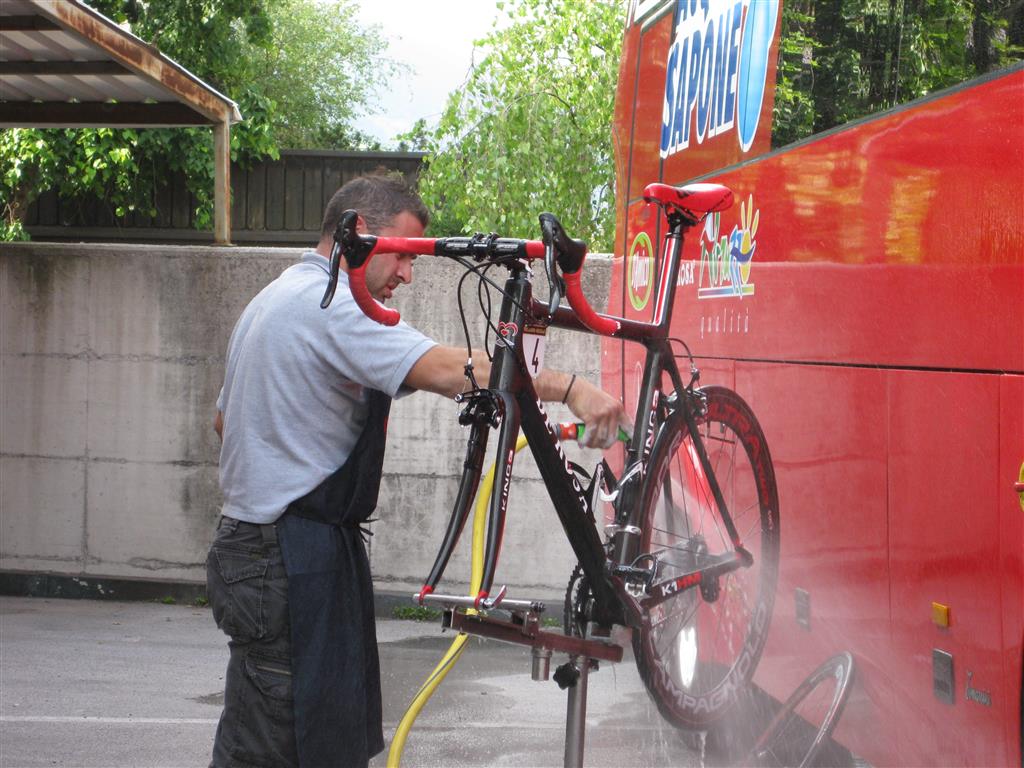 Achter het hotel waren de mecaniciens van de Italiaanse ploegen Acqua et Sapone en LPR- Farnese Vini bezig met het schoonmaken van de wonderschone De Rosa King fietsen. De kopman Danilo di Luca kwamen we nog tegen in de lift –klein menneke. Later zou hij uit de uitslag geschrapt worden. Ook de winnaar van die dag Michele Scarponi was nou ja, hmmm…