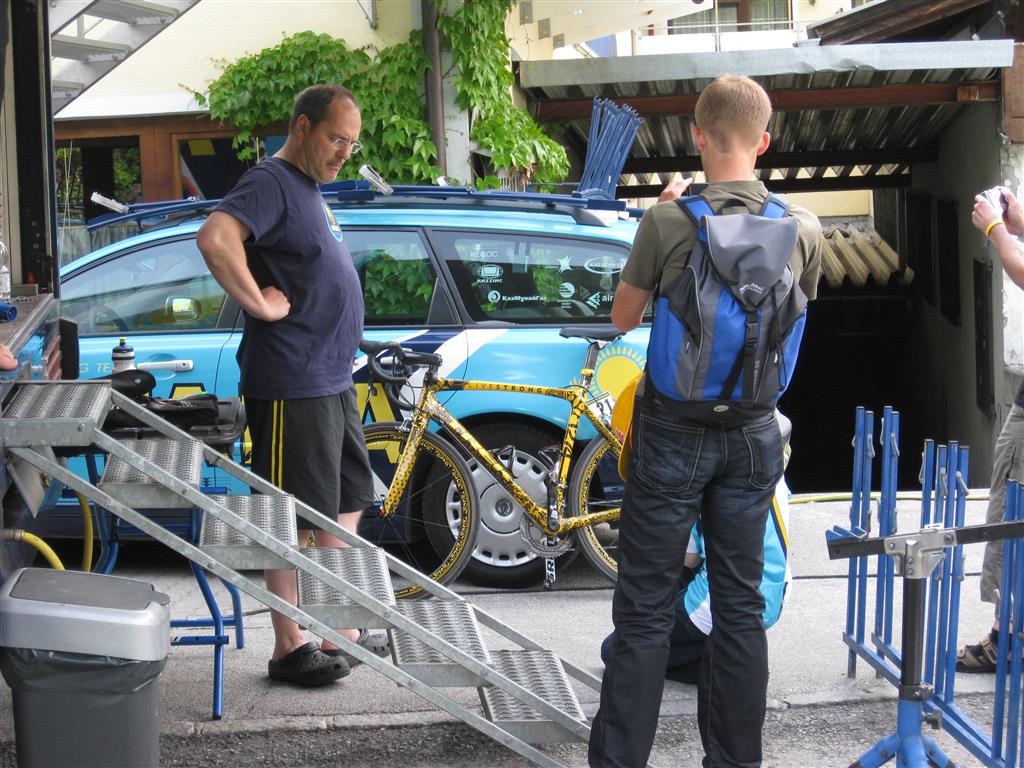Ook Lance Armstrong zou er zijn. Alleen niemand wist ‘hoe en waar’. Er werd verteld dat hij ergens anders zou slapen. We hebben hem niet gespot, maar wel zijn fiets. Een gestippelde Trek Madone in Livestrong-kleuren.
