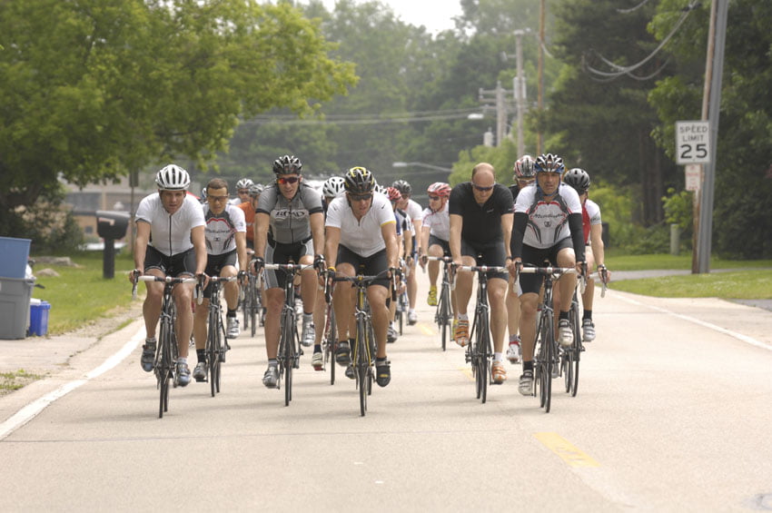 We kregen Lance zelf pas te zien in de VS in juni 2007. Toen was hij gestopt en kon hij reclame maken voor ‘the all new Madone’. We deden testrit met een oude OCLV, kregen een indrukwekkende introductie in een museum en een rit met de nieuwe fiets. Naast Lance en andere journalisten met een paar Harley’s met zwaailichten. We probeerden nog een gesprekje aan te knopen via het onderwerp D. Overgaag, maar dat was een ‘no go’…