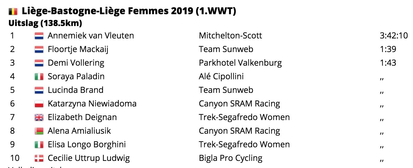 🏆 @AvVleuten wins #LBLwomen 2019! pic.twitter.com/R64IoUh4IC — Liège-Bastogne-Liège (@LiegeBastogneL) 28 april 2019