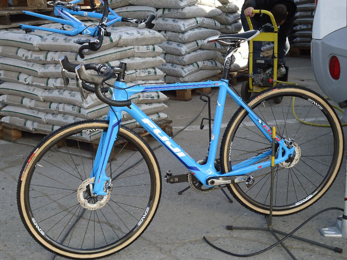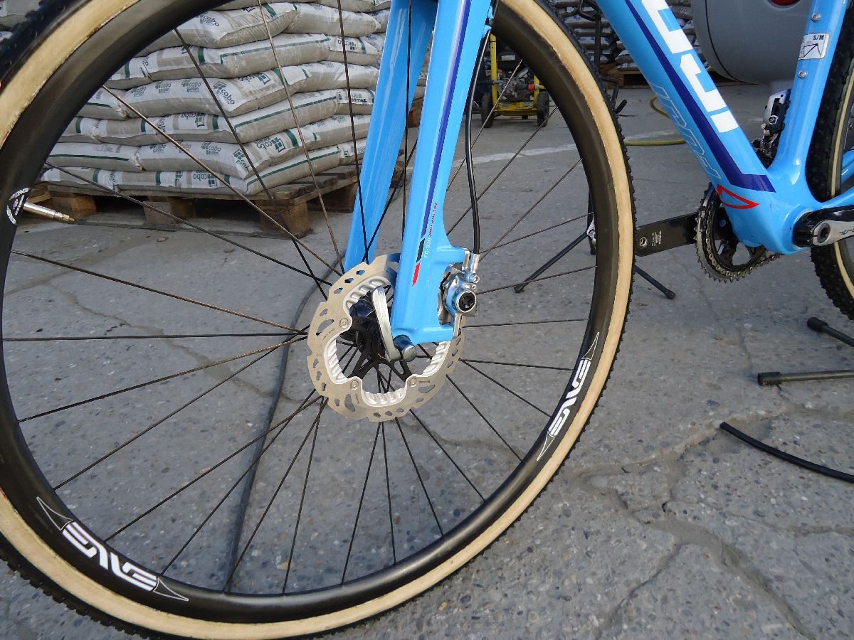 De reden? Toen de fietsen opgebouwd werden waren er (nog) niet voldoende remsetjes beschikbaar. En de R 785 hendels werken prima met XTR blijkt. De remleidingen lopen buitenlangs de voorvork en het frame. Of er veel verschil is tussen XTR en de standaard R785 remmen is lastig te zeggen. Het remt allebei prima in de cross. Page zou de wedstrijd in Niel voor het einde verlaten overigens.