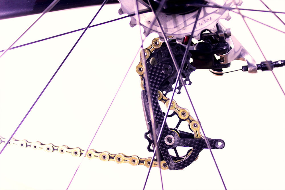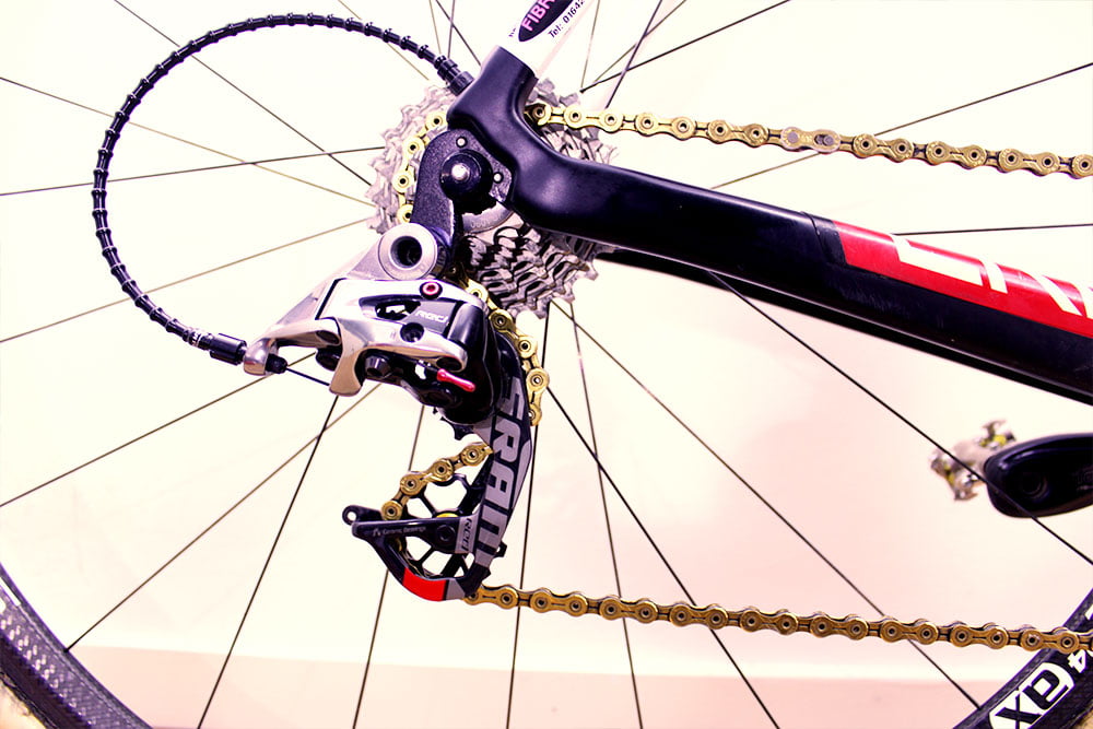 Achterderailleur: Sram red, alluminium bouten, fibrelyte backplate, Massi carbon derailleurwieltjes