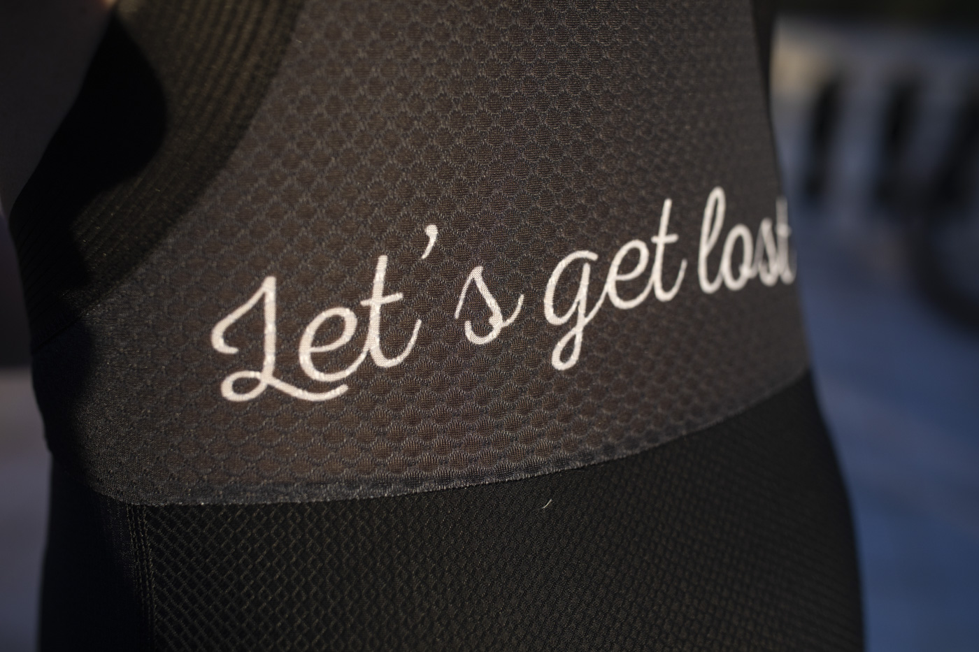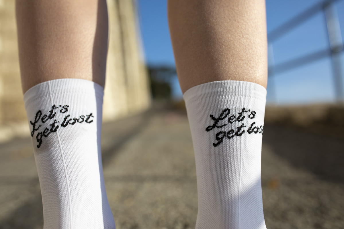 Bij het shirt hoort de LET’S GET LOST- broek. De pasvorm is prettig. De banden van de bretels lopen goed op de juiste plaats en alle naden zijn mooi gestikt en fraai afgewerkt. De broek is overwegend zwart en zo ook goed te gebruiken met andere shirts. De zeem is dik en goed voorgevormd. Dat is allemaal best. Hij is echter behoorlijk ver naar voren gestikt waardoor je niet echt goed op de zeem zit en dus veel comfort mist. Wanneer de zeem een centimeter of wat naar achteren wordt verschoven is het een heel behoorlijke broek.De complete kit, inclusief kekke sokken ziet er zeer degelijk uit. Mooi in zijn eenvoud, maar boordevol fraaie details en prachtige design. Aanrader!