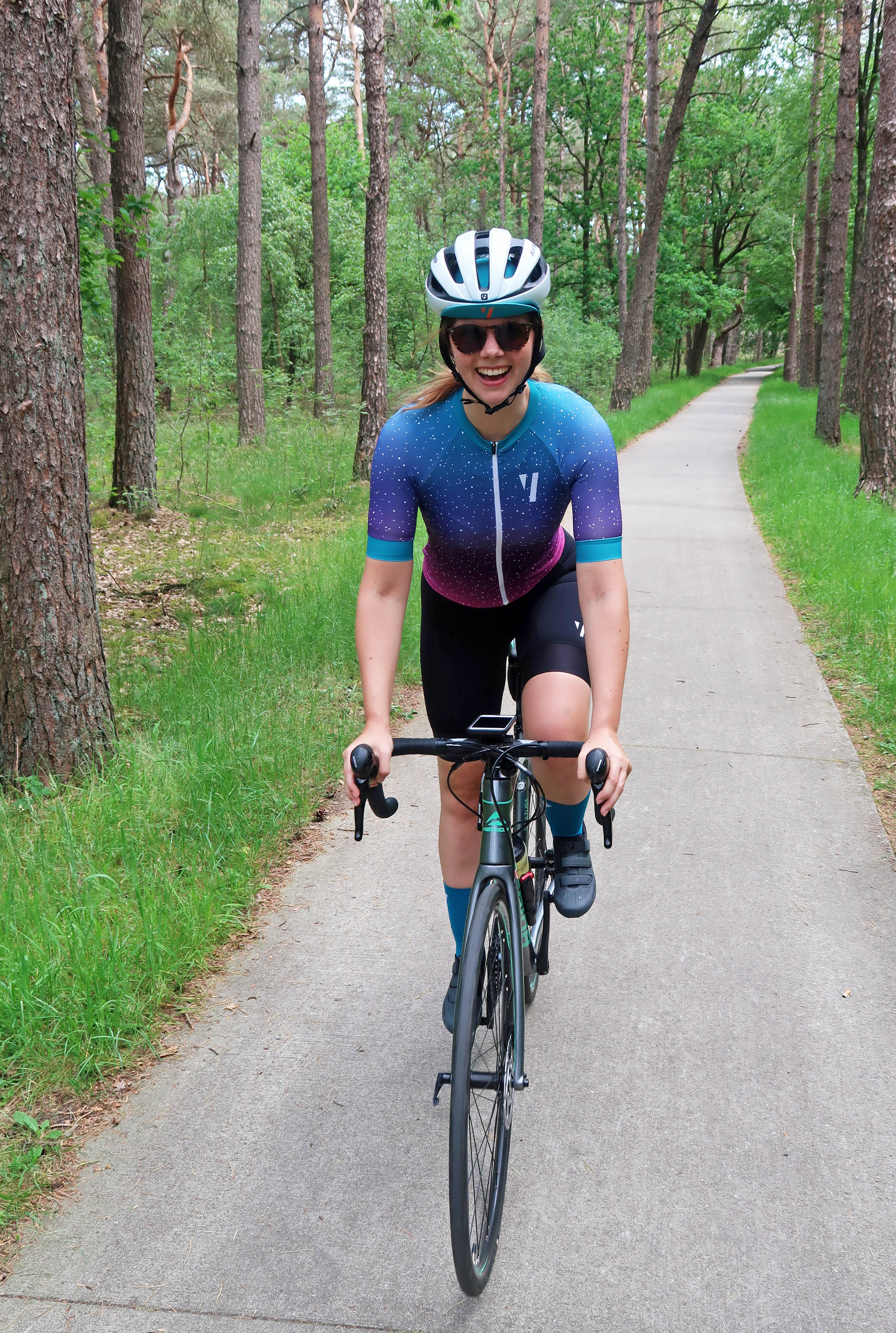 Wat betreft de pasvorm: de jersey zit strak, behoorlijk strak zelfs. Het gaat hier om een echte race-fit, waarbij de jersey volledig aansluit om het lichaam. Volgens VOID voor een ‘aerodynamische fietspositie’. Die één houdt hiervan, de ander heeft liever een wat lossere pasvorm. In dat geval kan je gewoonweg één maat groter bestellen en heb je alsnog een mooie aansluitende jersey, zonder dat het strak aanvoelt. Ook als je de jersey iets langer aan de voorkant wilt of wat losser om de bovenarmen, kan ik een maatje groter aanbevelen. Ondanks de strakkere pasvorm is de jersey alsnog erg comfortabel te noemen. De stof is extreem ademend en hierdoor heerlijk op de warmere dagen. Ook de ronde hals is erg aangenaam, de col is namelijk wat lager uitgesneden, waardoor je geen last hebt van een rits in de nek. De bibshort zit trouwens ook heerlijk, met hele comfortabele bretels die niet trekken en reflecterende logo’s. Het enige nadeel van de broek is dat de siliconen grippers onderaan de pijpen iets strakker zitten. In mijn geval (stevige bovenbenen) had dit voor het mooie iets losser mogen zijn, maar goed, met slankere benen heb je hier absoluut geen nadeel van. Persoonlijk dingetje dus 😉