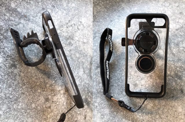 Voor het bevestigen van de telefoonhoes aan je racefiets of mountainbike heb je twee opties. Hierboven zie je de eerste, de Bike Handlebar Mount. Verreweg de meest simpele methode, want je plaatst de flexibele, maar stevige ring binnen 10 seconden om ieder gewenst stuur heen. Ook fijn: je kan ‘m heel eenvoudig positioneren. In mijn geval kan ik zelfs m’n fietscomputer laten zitten en gebruiken.